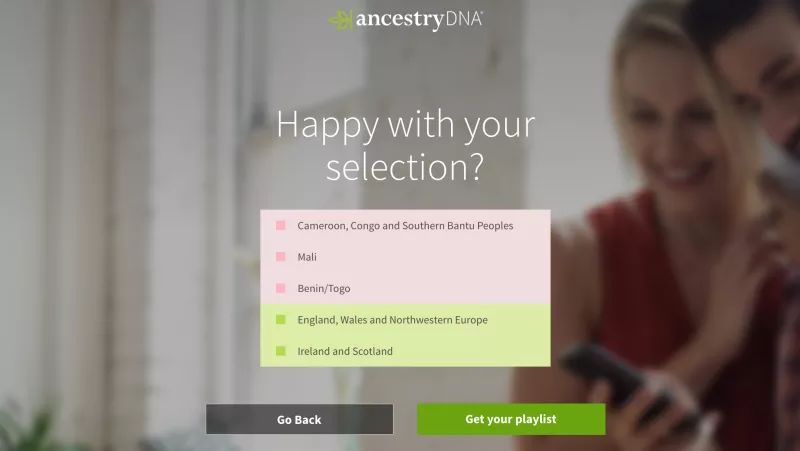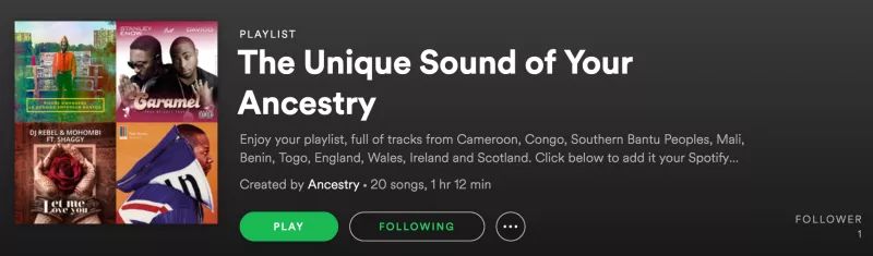 比起基因检测,Ancestry的优势或许更在于拥有北美最大的用户族谱数据库,比如,可以检测到“爱尔兰、苏格兰、法国、英国、威尔士和西北欧、欧洲德语区和芬兰”是你血统的前五大来源,Spotify则据此生成一张歌单,里面有德国爵士组合演奏的现代流行、摇滚、嘻哈、R&B等风格的音乐,以及一首瑞士民谣四重唱。当然,如果你的血统里,南欧和东南亚血统偏多,收到的歌单又是另一种感觉。
