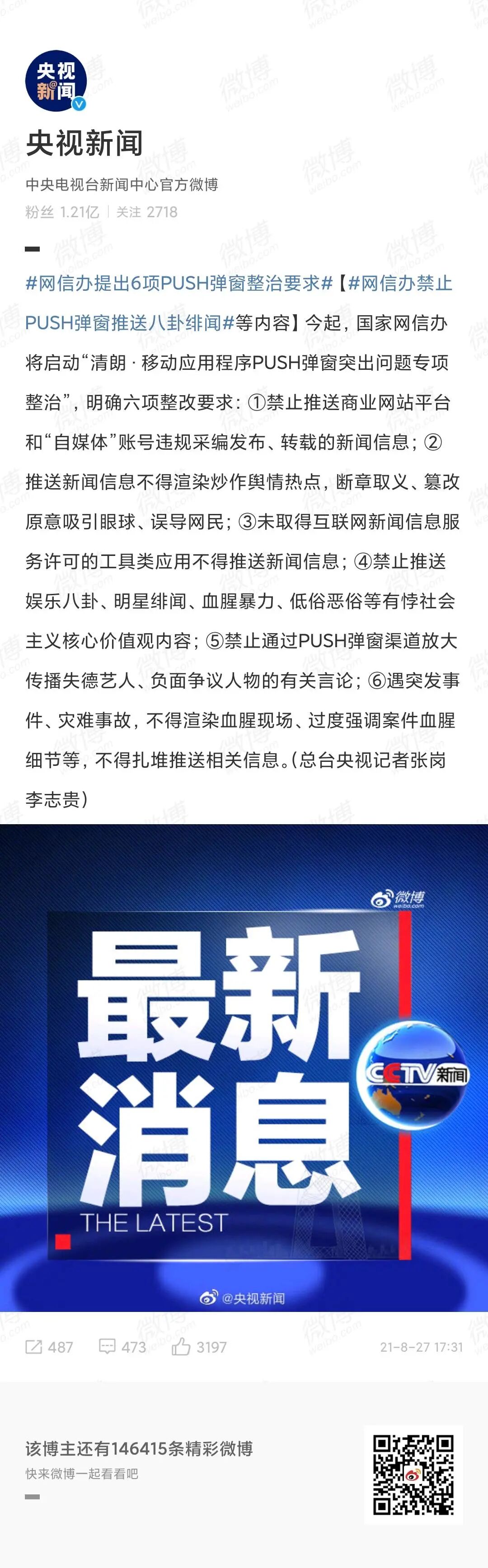 新榜讯 8月27日,国家网信办决定启动“清朗·移动应用程序PUSH弹窗突出问题专项整治”。据介绍,此次专项整治重点面向新闻客户端、手机浏览器、公众账号平台、工具类应用等4类移动应用程序,明确六项整改要求,包括禁止PUSH弹窗推送商业网站平台和“自媒体”账号违规采编发布、转载的新闻信息,推送新闻信息必须采用规范稿源;禁止PUSH弹窗推送娱乐八卦、明星绯闻、血腥暴力、奇闻异事、低俗恶俗等有悖社会主义核心价值观内容等。新榜讯 8月26日,中国人民大学人口与发展研究中心与抖音联合发布了《中老年人短视频使用情况调查报告》。《报告》显示,截至2021年4月,抖音60岁以上创作者累计创作超过6亿条视频,内容类型包括风采展示、亲子互动、创意特效、美食美景、动植物养护等,累计获赞超过400亿次。14. 微博回应“花钱撤热搜”:热搜排序不存在任何商业售卖位置