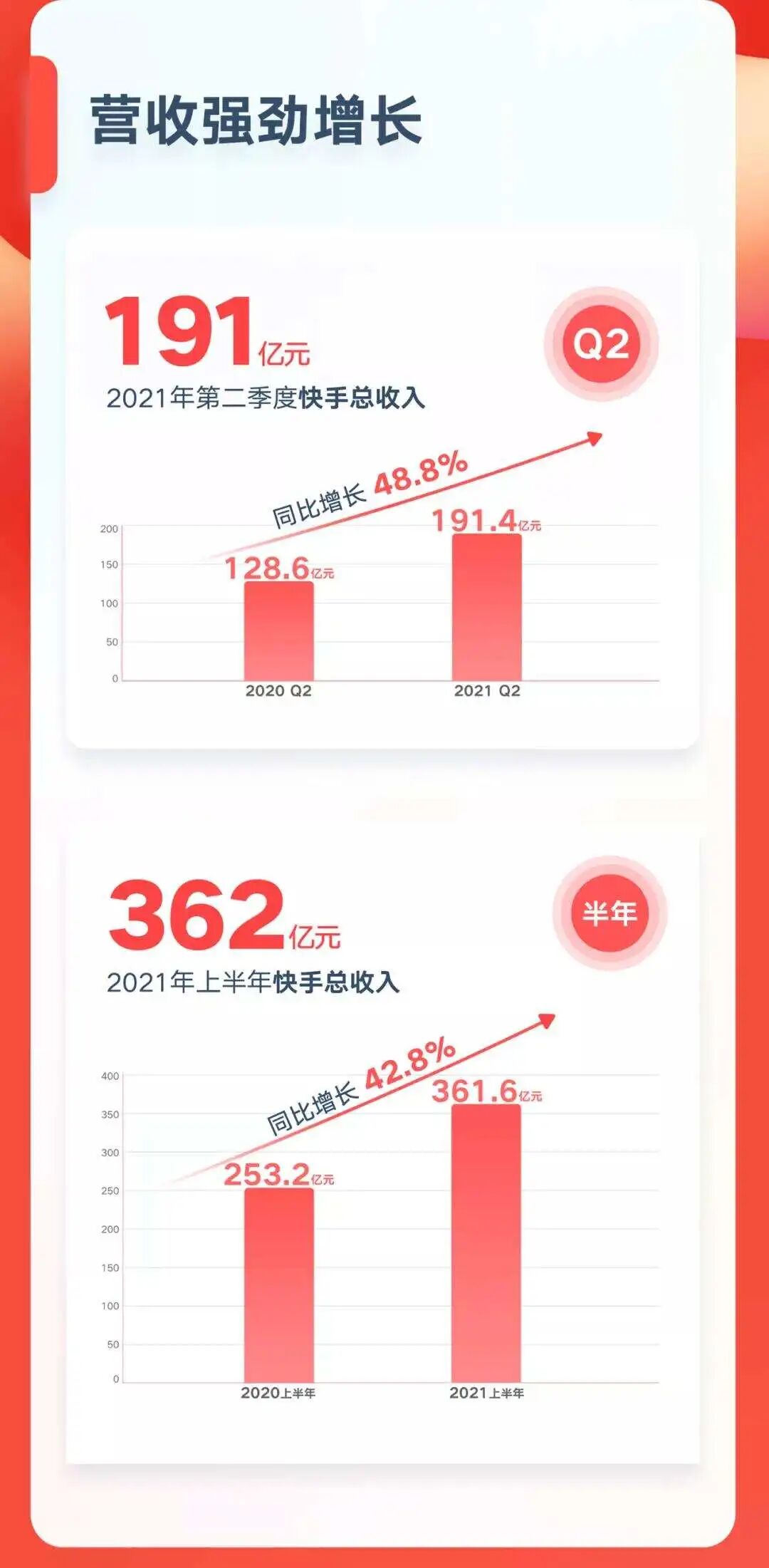 据Tech星球 近日,抖音App在首页加入了“长视频”专区,与此前爆料的“学习”入口相并列。此外,在新版的抖音中,用户在刷短视频的同时会刷到一张社交卡片,该卡片会显示有一位用户关注了你。另外,抖音还在首页的短视频界面中增加了线上多人聊天功能,除了发文字外,还可以发送语音,并邀请好友加入。8. 快手二季度营收191亿元,同比增长48.8%