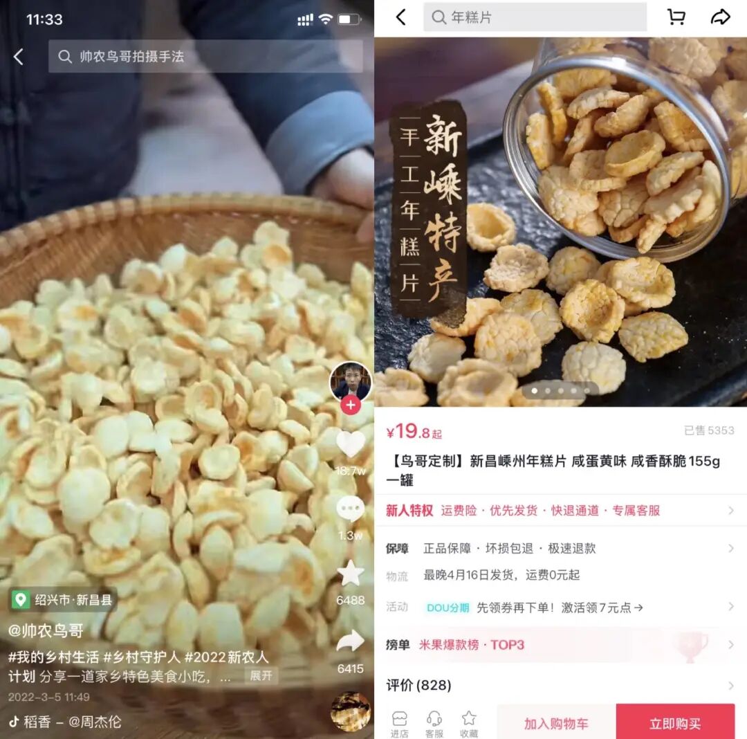 新抖数据显示,鸟哥已带货31种商品,累计销售额约54万。他开了一家自己的网店,叫“帅农鸟哥农产品小店”,售卖零食年糕片、龙井茶茶叶、鸡爪等产品,其中最受欢迎的是曾出现在视频中的嵊州特产年糕片,目前订单5353单,累积销售额10万余元。好的乡村视频,能够让城市人获得安慰,乡村人获得共鸣,让更多人看到农村发展的样貌。如今,鸟哥还在持续更新着乡村视频,过着他闲适的故乡生活。返回家乡,也许就如鸟哥常用的那首《稻香》唱的那样:
