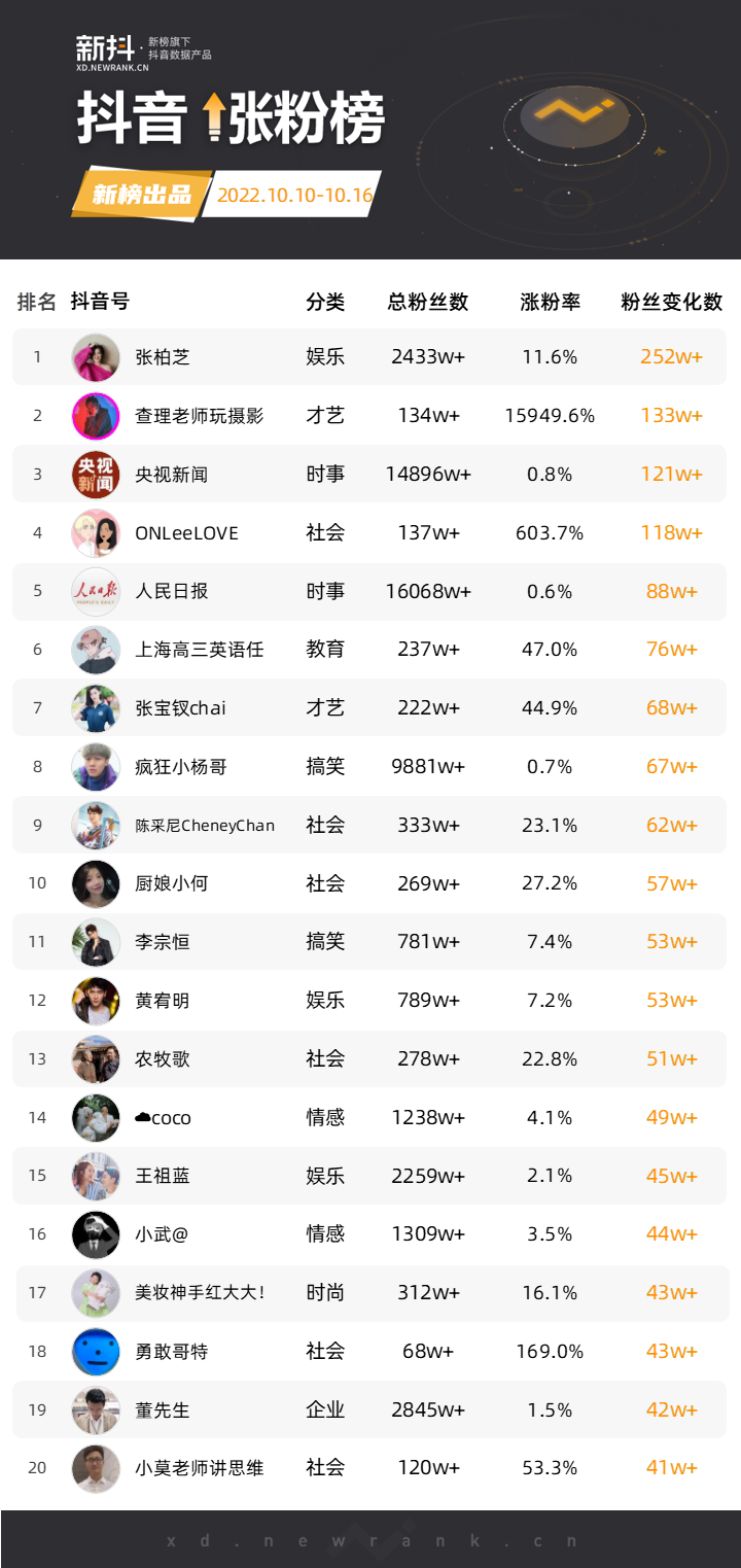 依托新榜旗下全场景AI数据平台“新抖”,新榜推出「抖音涨粉榜」,每周一期。本次统计周期为2022年10月10日到2022年10月16日。“张柏芝”登顶本周涨粉榜,一周涨粉超252万,涨粉率11.6%。10月31日,“张柏芝”在抖音举办了2022年的第一场带货直播。据悉,当天直播间销售额破亿,总销量破150万,累计在线观看人数超5000万。“ONLeeLOVE”位列本周涨粉榜第四位,一周涨粉超118万,涨粉率603.7%。该账号是一对中德情侣的生活vlog分享账号,对方经常一边化妆,一边进行一些或轻松或深度的话题对谈。10月10日,视频“当老公意识到自己说错话”获赞159.4万。![]()