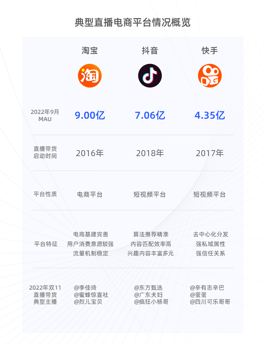 受黑天鹅事件疫情的影响,“确定性”成为各行各业频频提及的热词,直播电商的运营端也愈加关注整体的稳定性,多元化战略则成为运营端应对风险挑战的关键方案,其具体实施措施主要体现在三个方面:一是运营平台多元化,包括主播、机构的多平台布局。2022年双11期间,罗永浩、刘畊宏、俞敏洪等KOL纷纷入淘,交个朋友、东方甄选等机构和刘畊宏团队的主营平台也由抖音拓展为“抖音+淘宝直播”。此外,机构遥望科技面向不同平台运营了不同的账号,如淘宝直播“遥望梦想站”、抖音平台“遥望未来站”、快手平台“遥望幸福站”,追求更稳定的发展,成为2022年双11直播电商的重要趋势。二是运营账号矩阵化,机构开始布局矩阵账号,如交个朋友矩阵、蜜蜂矩阵账号。三是运营模式多元化,包括内容达人拓展变现形式,开启直播带货;带货达人强化内容属性,输出自制内容。如美食UP主“盗月社”开启直播带货,电商主播李佳琦自制综艺《所有女生的offer》。观察2022年双11前夕运营端多元化趋势中,可以发现淘宝直播是主播、机构的重要流向平台。分析其原因,主要是淘系完善的电商基建、高价值人群、稳定的经营流量,能够满足运营端“确定性增长”的需求。电商基建方面,淘宝电商依托淘系,拥有近二十年的电商资源积累,货品资源丰富,拥有全品类最多的国内外顶级品牌,全年上架商品数以千万计。此外,淘宝直播还重视直播选品池建设,并于2022年初,推出“直播严选”IP,为机构和主播提供更具品质与性价比的商品,同时降低消费者购买决策成本。消费人群方面,淘宝直播能够链接海量高价值消费人群,且转化高、变现快,复购强。阿里巴巴集团发布2022财年年报显示,过去一个财年,超过1.24亿消费者在淘宝天猫年度消费超过人民币10000元,这些消费者的跨年活跃率高达98%。此外,近期淘宝直播公布的数据显示,淘宝直播过去一年为店铺引导沉淀了1.2亿新会员,人均购买超20次,日均ARPU值超过30元。经营流量方面,淘宝直播流量机制兼具“稳定性”和“爆发性”,适合长效经营和稳定增长。淘宝直播流量分配机制同时受历史直播表现和实时直播表现影响,即50%和历史经营数据相关,50%为实时性逻辑。主播和商家在淘宝直播既能够维持稳定经营,同时也有可能出现单场爆发情况。淘宝直播托生于淘宝商业生态体系,电商基建等方面具有优势。抖音作为短视频第一,内容优势分明,今年5月抖音电商升级“全域兴趣电商”,将进一步应用内容优势,以“被动兴趣内容+主动探索场景”双向驱动生意增长;快手拥有浓厚的私域社区氛围和强信任关系,快手电商对自己的定位是“新市井电商”,即以直播间为超级节点,由信任驱动的体验型电商。直播电商的本质是电商,关键在于依托成熟的电商生态,提供“多快好省”的高质量服务