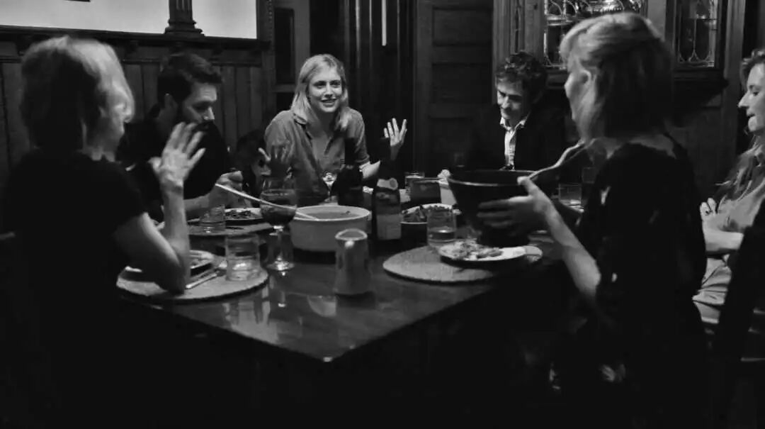 我想分享一下,我在这个片子里最喜欢的一幕,是在一个周围都是相对陌生的人的酒局上,Frances有一个非常深度的自我袒露: