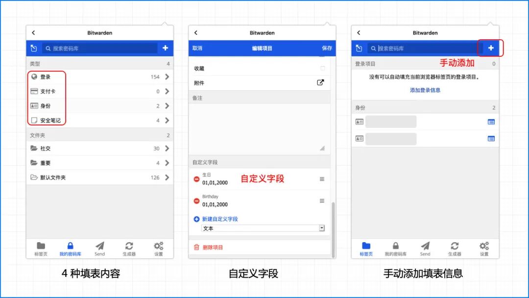 BitWarden 的自动填表功能包括 4 类:登陆、支付卡、身份、安全笔记。