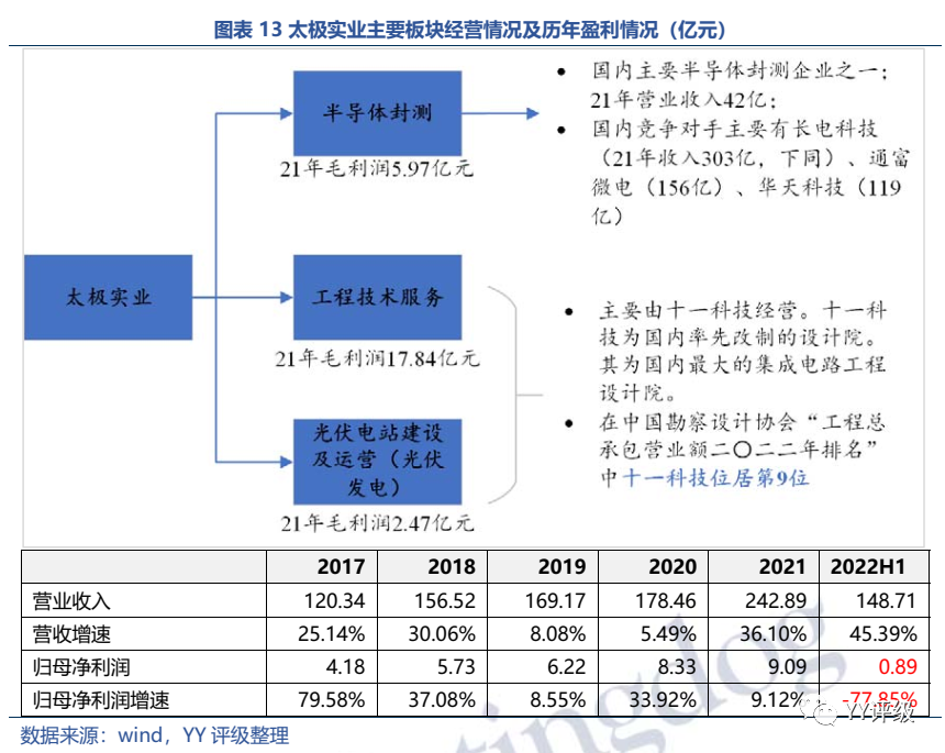 03 直投业务和产业资源持股方面,截至21年末投资余额11亿,以持有的两家上市公司太极实业(约3亿元)和力芯微(约5.6亿)为主。太极实业因经营违规,22年预计减少利润约10亿(21年归母净利润也才9亿),公司面临长投减值压力;力芯微21年上市为公司实现约5.6亿的公允价值增值,但相比同业市场份额较小、产品种类较少、研发投入不足、下游议价能力弱等问题。此外,在半导体行业整体行情走弱以及两家公司负面事项的扰动下,其市值均持续下滑,公司相关资产价值面临缩水风险。