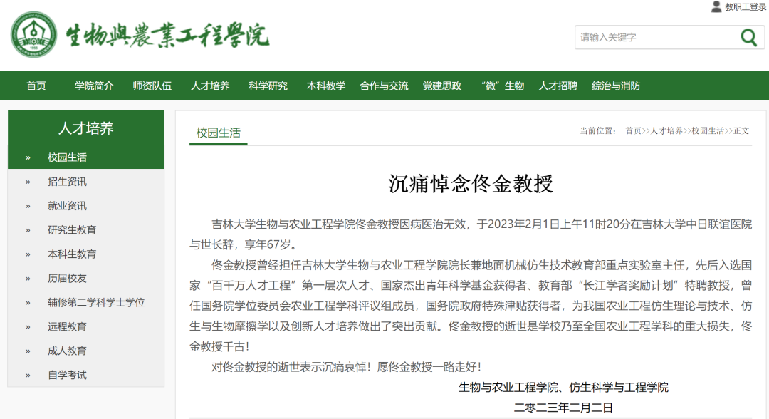 据吉林大学生物与农业工程学院消息,佟金教授因病医治无效,于2023年2月1日上午11时20分在吉林大学中日联谊医院与世长辞,享年67岁。