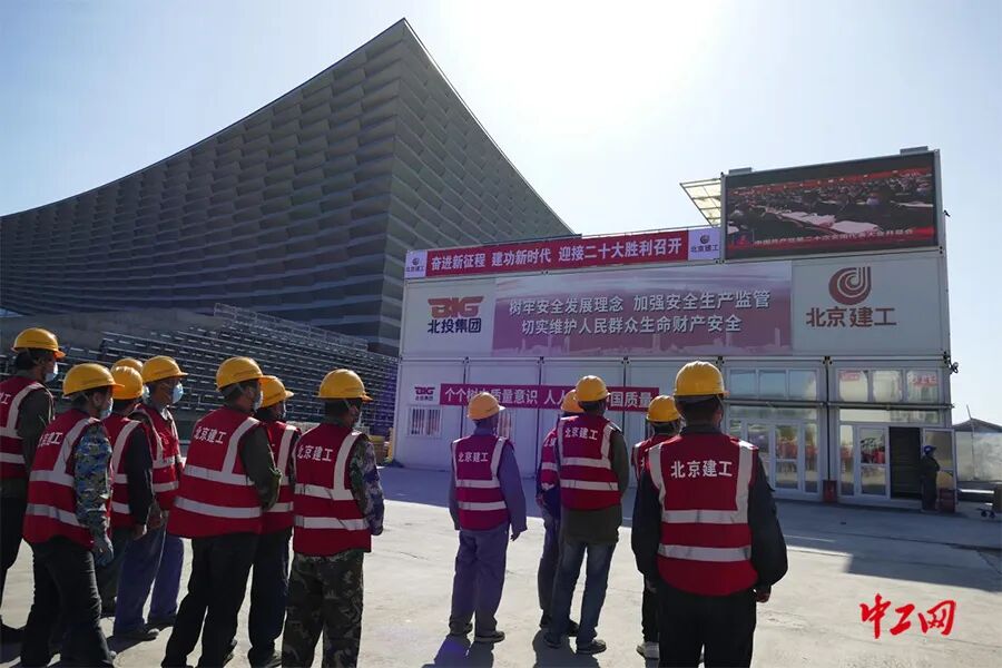 北京城市副中心施工一线的建设者们在城市副中心剧院工程前观看党的二十大开幕会盛况。 中工网记者 鄂璠 摄