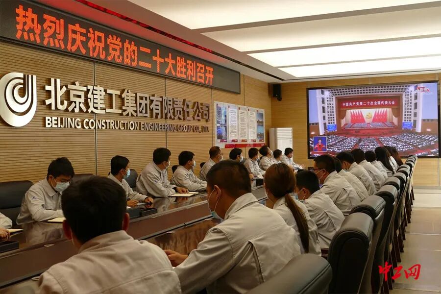 数十名管理人员与工人在城市副中心剧院工程建设单位北京建工集团的会议室里观看党的二十大开幕会盛况。 中工网记者 鄂璠 摄