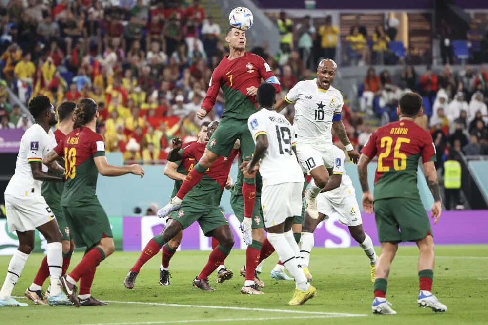 11月24日,葡萄牙对阵加纳,图为葡萄牙队球员C罗(上)在比赛中争顶。新华社记者 曹灿 摄