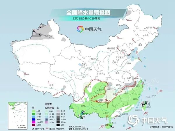 后天,新疆西南部高海拔山区、西藏东部和北部、陕西南部、重庆东北部、湖北西部等地的部分地区有小到中雪或雨夹雪;西南地区东部、江南大部、广西西部和北部、海南岛、台湾岛等地的部分地区有小到中雨。