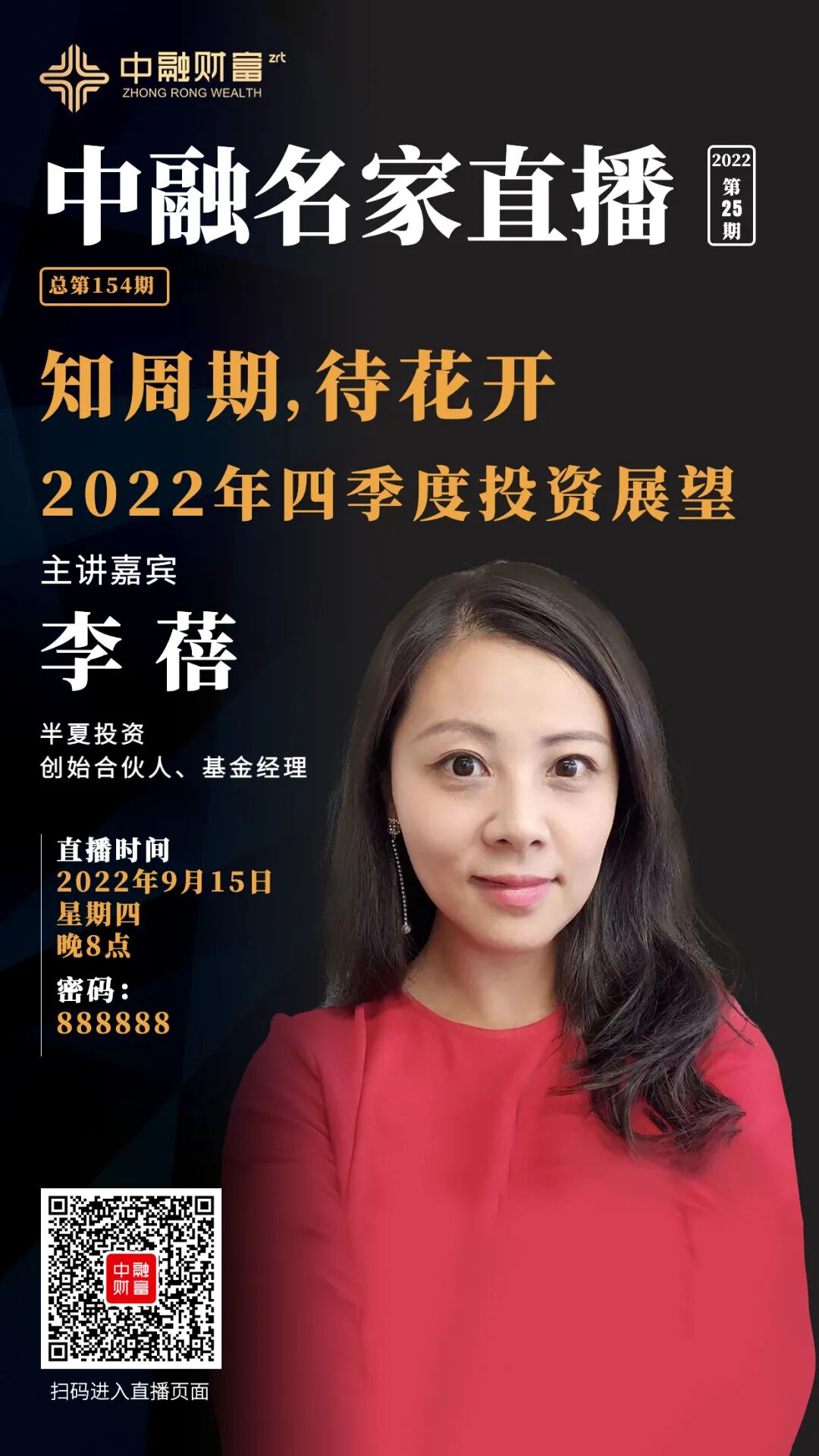 2022年的资本市场可谓经历了多只黑天鹅与灰犀牛的冲击,地缘冲突、美联储加息、疫情反复、地产下滑等。国内资本市场,权益与商品类资产短期均出现过较高的波动。与此同时,国内不断出台稳经济、保增长的一系列措施来对冲和应对国际市场的不确定性风险。今年是否还有投资机会乃至明年如何布局,今晚8点中融名家直播特邀到了半夏投资创始合伙人、基金经理李蓓女士为财富客户拨开云雾、指点迷津。