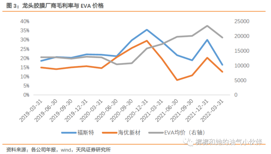 2.1. 光伏行业高速扩张,胶膜年化需求增速可达18%全球能源转型大势所趋,特别是近期化石能源价格高企和俄乌战争的催化作用下,光伏作为最具竞争力的新能源形式之一,行业整体已经摆脱对政策补贴的依赖,形成以市场驱动为导向的良性发展模式,光伏产业保持高速增长,根据海优新材年报数据,2007年-2020年,全球新增装机复合增长率达到34%;截至2020年底,全球累计光伏发电量达到756GW。根据CPIA对全球光伏装机的预测,按照光伏组件安装量和生产量配容比1:1.2,每GW光伏组件使用1000万平方米胶膜来计算,在乐观情形下,2025年全球光伏装机容量达到330GW,对应光伏胶膜需求39.6亿平方米,较2021年年化增长率可达18%,光伏粒子需求有望从2021年102万吨增长至198万吨。2.2. 高性能胶膜需求不断增长,白色EVA胶膜和多层共挤POE胶膜深具潜力当前主流的胶膜主要有4种:透明EVA胶膜、白色EVA胶膜、POE胶膜、多层共挤POE胶膜,其中透明EVA占市场份额的56.7%,白色EVA胶膜市场份额17.6%,POE胶膜和共挤型POE胶膜占比合计25.5%。近年来,光伏发电成本不断降低、光伏装机市场逐渐扩大,倒逼组件生产成本不断下降,同时为提升电站收益,延长使用寿命,对胶膜的材料性能要求越来越高,由透明EVA向白色增效EVA胶膜和共挤型EPE胶膜转型是大趋势,相对于透明膜而言,主要优势:白色胶膜反射率高,表面粗糙增加光线反射,位于电池片下层,可以提升组件的整体发电效率;同时具有有优异的材料兼容性,与电池片、背板具有良好的粘结性;白色EVA胶膜还具有较强的抗湿热老化及紫外老化能力。多层共挤POE胶膜可以兼具POE超强的材料性能和EVA良好的层压工艺性能,多层共挤POE胶膜透水率低,仅为同等厚度EVA薄膜的1/5,可大幅提升组件耐候性能;因阻水而醋酸产生极少,在高湿度环境下及搭配某些水汽敏感/醋酸敏感电池时优势明显;与此同时,多层共挤POE胶膜可以兼具EVA胶膜良好的加工性能,即生产成品率高、效率高、胶膜容易保存。多层共挤POE胶膜:单晶PERC双面电池为代表的高效组件发展迅速,产能大规模提升,成本持续下降, 对于双面电池的双玻组件而言,使用多层共挤POE胶膜在组件生产效率和组件综合性能层面有较强竞争力。新型太阳能电池技术大多采用N型硅片,要求胶膜具有更高的抗PID性能,利好POE胶膜。此外,多层共挤POE胶膜可以兼具POE超强的材料性能和EVA良好的层压工艺性能,该技术逐渐被更多的组件厂商接纳,未来市场份额有望进一步提高。白色EVA胶膜:为进一步提升组件发电功率,组件厂商多在电池背侧应用白色EVA胶膜,以提升发电功率,当在单面高效半片组件和多主栅组件中,由于电池间隙较多,同时伴随着电池薄片化趋势,白色EVA胶提升组件功率效果更加明显,同时还可以降低对背板内侧薄膜的耐紫外线要求,未来对白色EVA胶膜的需求有望持续增长。当前胶膜市场头部三家企业市场占有率超过80%,规模效应明显,成本管控和资金实力更强,且当前行业技术迭代快、研发投入大、规范化程度不断提高。而新进入者初期规模小、技术积累少、盈利能力与质量管控较头部企业会有较大差距,光伏胶膜行业正进入加速整合期,优势企业市场份额有望持续扩大注:文中报告节选自天风证券研究所已公开发布研究报告,具体报告内容及相关风险提示等详见完整版报告。