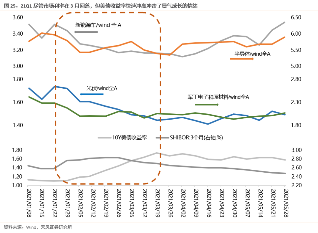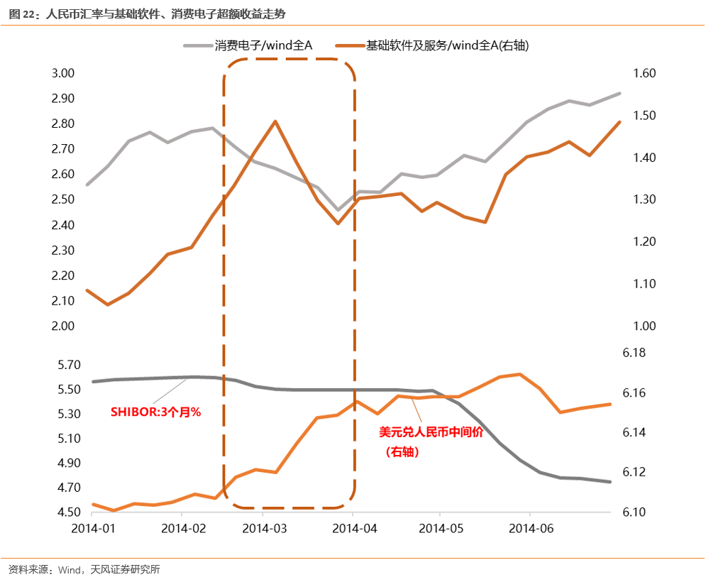 (2)国内流动性环境变化:2012年年底利率上行导致消费电子跑输市场;2014年年底利率上行引发的基础软件跑输市场;20Q3-Q4市场利率上行半导体承压;2019Q2和Q4市场利率上行导致PCB调整;2021Q1银行间利率上行引发光伏、新能源车、军工电子、半导体调整