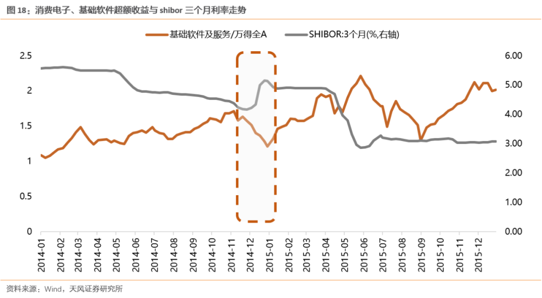 尽管从年度为单位来看,成长风格板块基本上跟随着产业周期的情况而变化,但在短期内,流动性环境的变化的确会引发成长板块的波动,流动性的收紧往往会对前期涨幅较大的景气成长板块形成压制。(1)2012年底市场利率上行引发消费电子跑输市场在2012年前三个季度连续的降准降息后,市场利率在8月开始触底回升,shibor三个月利率从2012年8月的3.6%以下上升至2013年年初的3.9%附近,导致前期表现较好的消费电子阶段性跑输市场。(2)2014年年底利率上行引发的基础软件跑输市场在全年走低后,市场利率水平在2014年年底快速上行并持续到2015Q1,对应基础软件涨跌幅为负,并大幅跑输市场。以shibor三个月利率衡量宏观流动性,可以看到市场利率从2014年11月的4.18%上升至年底的5.14%,并且在2015Q1稳定在4.9%附近,整体流动性环境显著从紧。而随着2015Q2流动性环境再度改善,基础软件的超额收益重新上行。![]()