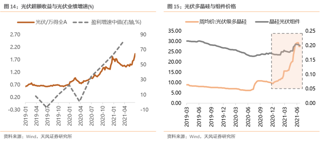 随着光伏上游原材料硅料价格的暴涨,对下游需求反噬的担忧使得光伏企业在主要景气成长板块中率先跑输市场。自2020年12月以来,上游硅料价格进入加速上涨期,多晶硅现货价格由12月初的10元以下,一路飙升至25元以上,提升至原来的3倍,而同期晶硅光伏组件价格仅上涨17.64%,因此,市场担忧上游价格的快速上涨最终会导致下游需求被侵蚀。最终,一季报延续的高增速验证了下游需求仍然较为旺盛,光伏上游原材料价格的上涨并未改变新能源产业周期的景气方向,最终光伏板块的超额收益也重新在4月触底回升。![]()