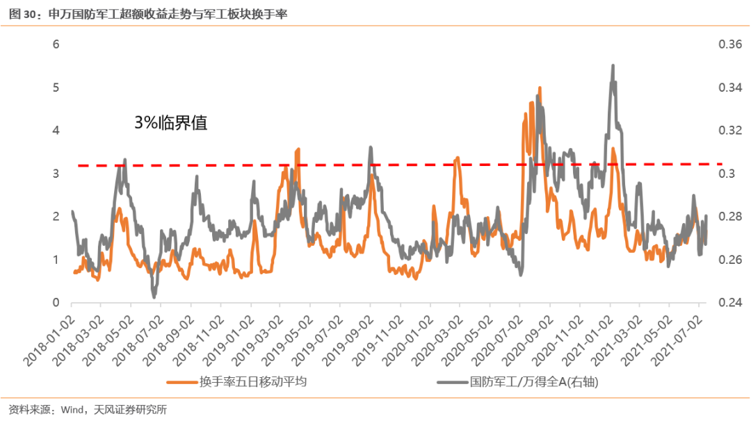 (3)2018年以来,申万国防军工指数换手率共有5次超过3%,当前申万国防军工换手率为1.7%:1)2019/3/8-2019/3/14,区间含5个交易日,换手率维持在3%左右,申万国防军工指数最大涨幅7.5%,随后申万国防军工指数进入顶部区域;2)2019/3/29-2019/4/9,区间含7个交易日,换手率维持在3%左右,申万国防军工指数最大涨幅7.5%,随后申万国防军工指数见顶回落;3)2020/2/21-2020/3/2,区间含7个交易日,换手率维持在4%左右,申万国防军工指数最大涨幅3.6%,随后申万国防军工指数见顶回落;4)2020/7/8-2020/8/21,区间含33个交易日,换手率维持在3%左右,申万国防军工指数最大涨幅28.8%,随后申万国防军工指数见顶回落;5)2021/1/6-2021/1/18,区间含9个交易日,换手率维持在3%左右,申万国防军工指数最大涨幅4.0%,随后申万国防军工指数见顶回落。![]()