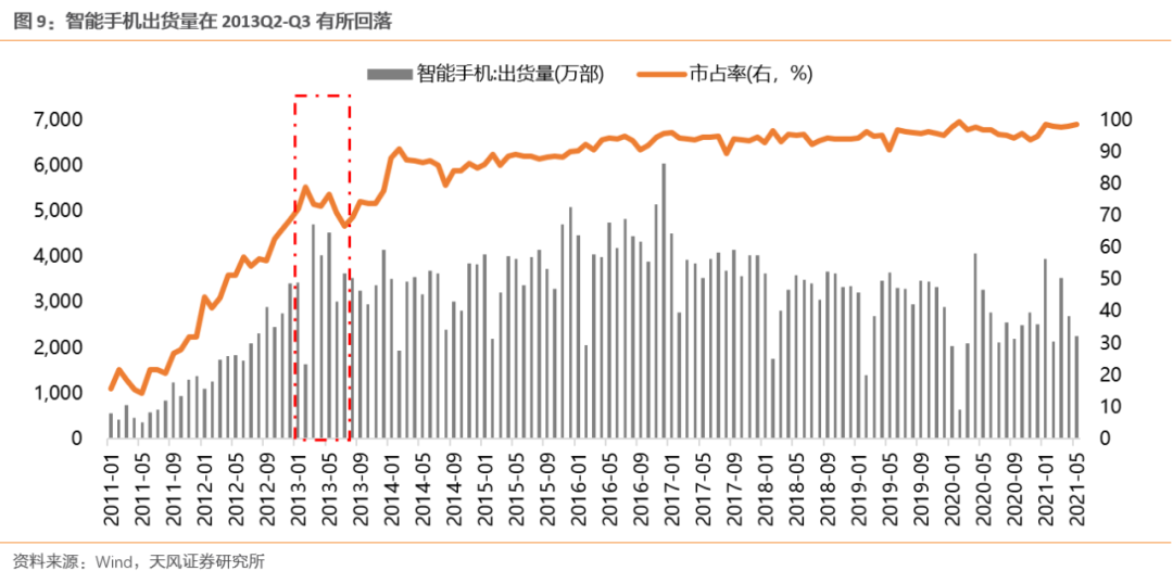 (1)基本面扰动:2013Q2-Q3智能手机市占率阶段性下滑导致消费电子业绩增速回落;疫情冲击下20Q1新能源车、军工电子、光伏景气度阶段性支撑走弱;21Q1上游原材料硅料价格上涨引发光伏中下需求走弱担忧