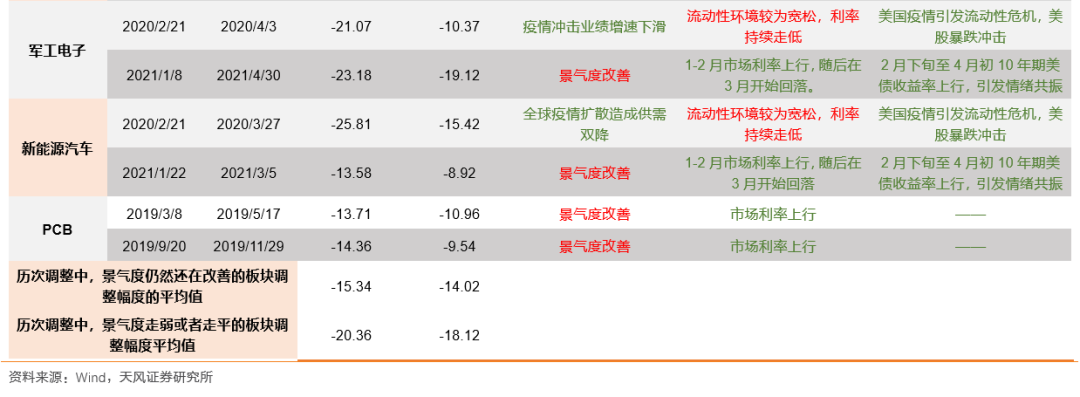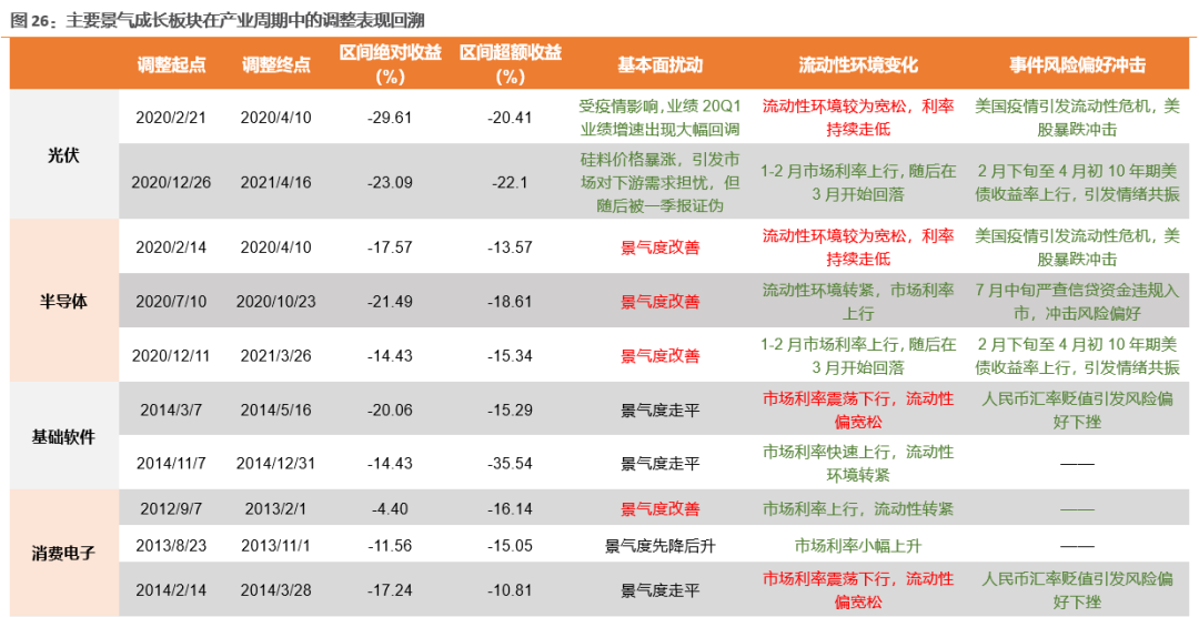 3、归纳来看,在短期扰动因素中,基本面扰动最终会被证伪,这也是支撑景气成长在后续可以继续获得超额收益的重要原因。阶段性景气度情况、扰动因素多少是影响调整幅度和时间的重要因素。而从调整时间和幅度来看,往往调整时间在2-3个月左右,区间跌幅往往在15%-20%左右,区间超额收益往往在-10%--20%之间;相比之下,景气度有改善的成长板块在出现短期调整的时候,平均调整幅度及跑输程度要小于阶段性景气度弱化的板块。而随着影响因素的增多,可能会延长调整的时间。