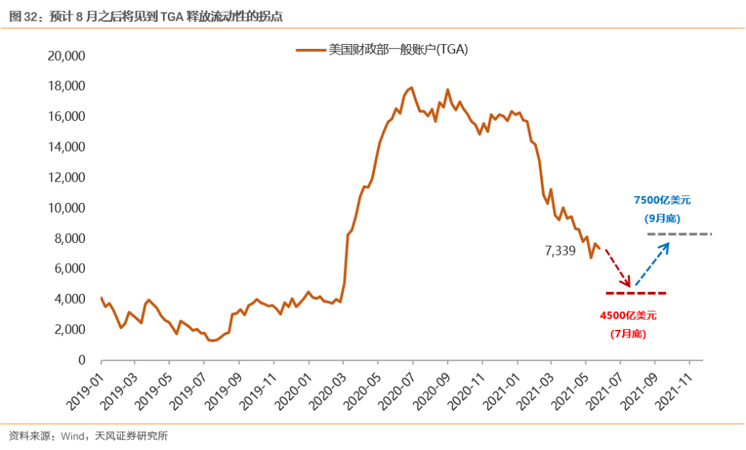 自于潜在外部冲击和交易过热,Q3冲击之后仍是买入机会对于当前的成长板块而言,调整需求主要来潜在外部冲击和交易过热。一方面,美元流动性方面,预计于Q3开始减弱,8月是观察窗口期,包括TGA释放流动性的拐点(银行间流动性减弱)、全球央行年会鲍威尔表态(Taper预期发酵),这可能会对风险偏好形成潜在的外部冲击。第一,对于TGA,美国财政部5月初估计:7月底债务上限豁免到期时,TGA将降至4500亿美元;之后,随着债务发行,9月升到7500亿美元(假定债务限额暂停或增加),将带来3000亿美元的流动性紧缩。因此,预计8月之后将见到TGA释放流动性的拐点。第二,以上一轮(2013年)缩量QE与就业恢复的节奏来看:2013年5月22日伯南克首次暗示削减QE3(对应非农就业约恢复了73%)、2013年12月18日正式Taper (对应非农就业约恢复了88%)。截至5月,本轮疫情冲击后非农就业约恢复了68%,若以今年月均50万的新增非农推算,则:3.2个月可恢复75%(2021年8-9月,释放缩量信号)、9.7个月可恢复90% (2022年2-3月,可能正式缩量)。三季度中后期可能进入Taper预期发酵的窗口期(关注8月全球央行年会鲍威尔表态),市场对非农数据的变化也会更敏感。另一方面,从交易的角度,以换手率进行衡量,部分景气成长板块存在交易过热的情况,这在一定程度上也构成调整压力。因此,总结来说,在产业趋势良好、基本面没有扰动、流动性环境相对稳定的背景下,当前景气成长板块的压力来自于潜在的外部冲击以及交易层面。但考虑到高景气板块并没有出现景气度的波动,虽然存在短期冲击,但不影响中期趋势,在有科技周期支撑的方向,未来仍将获得显著的超额收益。中期维度,继续把握“硬科技的盛宴”。核心配置:新能源、半导体、军工电子和军工材料(目前基本面预期差仍然较大,建议下半年重点关注)。卫星关注:AR/VR、智能汽车、物联网。1、在2009年以来,国内经历了几轮比较显著科技产业周期:第一条是围绕智能手机主线的2G-3G-4G-5G产业周期,代表性的板块就是09-10年的消费电子,12-15年的消费电子、基础软件,19年以来的半导体、PCB;第二条是围绕能源结构转换的新能源产业周期,代表性板块是2019年以来的光伏和新能源汽车;第三条是“十四五”订单驱动、有自主可控逻辑支撑的军工电子强周期。在上述科技产业周期的支撑下,上述成长板块均在区间内获得显著的绝对收益和超额收益。
