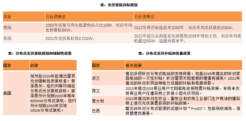 从政策端看,全球多国对新能源装机目标上调,例如德国将年均光伏装机目标调高至原来的4倍。针对分布式光伏而言,有的国家和地区制定装机规划或强制性安装要求,如美国多州明确分布式光伏装机目标;有的国家推出补贴政策、税收优惠政策等,如波兰在2021年推出针对农民自用电力设施的补贴和低息贷款,荷兰、意大利在2022年分别推出针对商业或农业分布式光伏的固定补贴政策。
