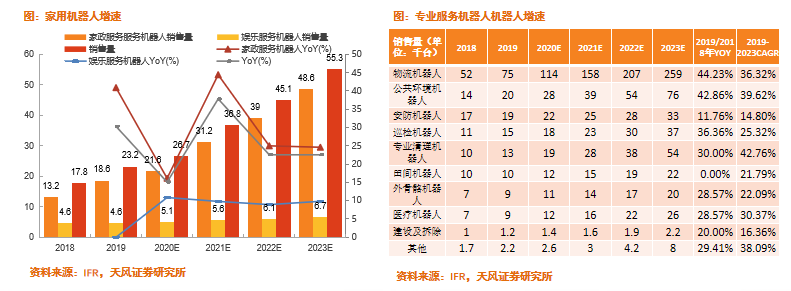 3)工业机器人按照下游应用行业分类展现出的特征是行业间逐步扩散,汽车、电子应用领域占比明显下降,新兴应用崛起,占比从15.22%提升到了28.42%,这一过程有利于我国本土机器人崛起(新兴领域四大及其他海外机器人先发优势相对较小)。4)我国本体出货量最大的为埃斯顿,全球市占率不及1%,仍有较大提升空间。工业机器人板块主要推荐埃斯顿、拓斯达,受益标的汇川技术(电新覆盖)、绿的谐波等。服务机器人:1)家政服务机器人(主要为扫地机器人)体量大、增速快,仍为主流方向,其在2019年的全球数量增速约为40%左右,而娱乐服务机器人2019年零增速,说明娱乐服务机器人(例如教育机器人)仍在场景摸索及产品完善阶段。2)与工业机器人不同,家用机器人的成长逻辑不是达到经济性,而是好用。我们测算得到家用机器人基本上都为千元级别,但家政服务机器人销量为娱乐服务机器人的4X左右,主要系前者已经落实较好的应用场景且可提供良好的使用体验。家用服务机器人领域,我们建议关注科沃斯、石头科技。![]()