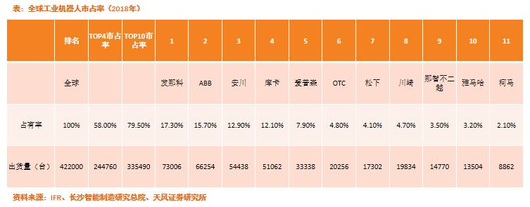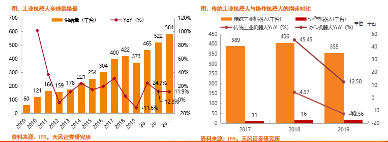 全球机器人数据重磅发布,IFR对未来三年工业机器人前瞻乐观。工业机器人:IFR对于全球未来三年工业机器人展望较为乐观,2020-2022年预计全球销量增速分别为24.7%、12.3%、11.9%。工业机器人按照下游应用行业分类展现出的特征是行业间逐步扩散,汽车、电子应用领域占比明显下降,新兴应用崛起,占比从15.22%提升到了28.42%,这一过程有利于我国本土机器人崛起。我国本体出货量最大的为埃斯顿,全球市占率不及1%,仍有较大提升空间。工业机器人板块主要推荐埃斯顿、拓斯达,受益标的汇川技术(电新覆盖)、绿的谐波等。服务机器人:家政服务机器人(主要为扫地机器人)体量大、增速快,仍为主流方向;与工业机器人不同,家用机器人的成长逻辑不是达到经济性,而是好用。家用服务机器人领域,我们建议关注科沃斯、石头科技。核心组合:三一重工、恒立液压、艾迪精密、浙江鼎力、春风动力、晶盛机电、捷佳伟创、建设机械、先导智能、国茂股份、中密控股、柏楚电子重点组合:中联重科、杰克股份、星云股份、佳士科技、杰瑞股份、拓斯达、弘亚数控、宁水集团、至纯科技、美亚光电、华峰测控、克来机电、伊之密本周专题:全球机器人数据重磅发布,IFR对未来三年工业机器人前瞻乐观IFR(国际机器人联合会)于10月4日发布2020年年度报告,披露了一系列关键数据。工业机器人:1)全球范围:2019年全球销量为37.3万台左右,同比下滑11.6%,这是近10年来除2012年以外的首次下滑;IFR对于全球未来三年工业机器人展望较为乐观,2020-2022年预计全球销量分别达到46.5、52.2、58.4万台左右,增速分别为24.7%、12.3%、11.9%。2)中国工业机器人需求展现出较强的韧性。2019年我国大陆销量下滑8.77%,相较于日本、美国、韩国、德国等传统工业强国的下滑幅度明显较小。![]()