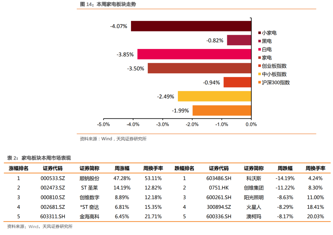 本周家电板块走势:本周沪深300指数-1.99%,创业板指数-0.94%,中小板指数+2.49%,家电板块-3.5%。从细分板块看白电、黑电、小家电涨跌幅分别为-3.85%、-0.82%、-4.07%。个股中,本周涨幅前五名是顺钠股份、ST圣莱、创维数字、*ST奋达、金海高科;本周跌幅前五名是科沃斯、创维集团、阳光照明、火星人、澳柯玛。