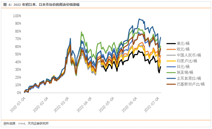 2022年初以来,Brent油价(美元计价)累计涨幅24%。但是考虑到一些国家或地区的汇率贬值,以欧元计价、人民币计价、印度卢比计价、日元计价的原油价格上涨幅度分别为37%、31%、32%和47%。更为极端的,斯里兰卡卢比计价的油价上涨了120%。其中以欧元计价的原油价格创历史新高。