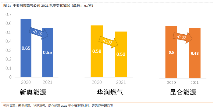 在2021年上游高气价的影响下,城市燃气公司承受了成本压力。新奥能源毛差下降0.10元/方,华润燃气毛差下降0.07元/方,昆仑能源毛差下降0.02元/方。