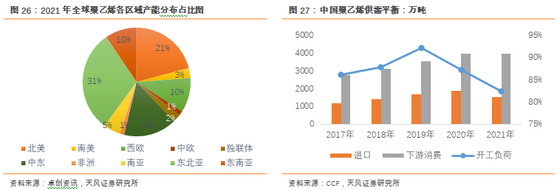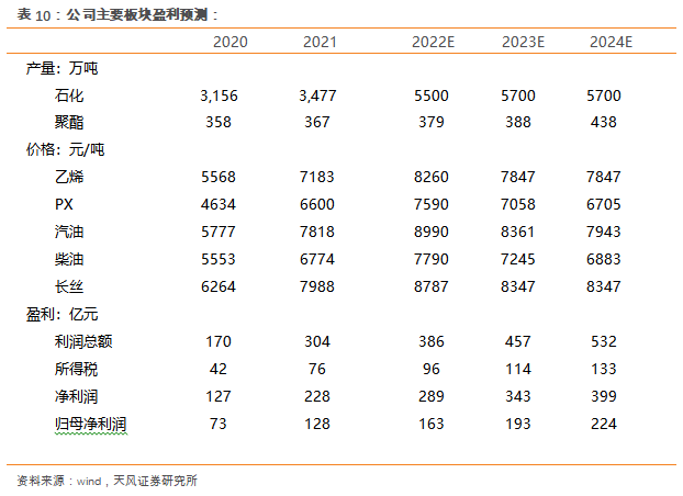 1. 公司产业链概况——自下而上延伸产业链,奠定垂直一体化优势荣盛石化是国内综合实力领先的石化和纤行业龙头企业之一,公司成立于1995年9月,2010年在深圳证券交易所上市,公司产业链秉承自下而上的发展策略,由传统的纺织制造逐渐向上游聚酯—PTA—PX产业链延伸,2015年,中金石化160万吨PX项目投产,形成了“PX-PTA-聚酯-纺丝”全产业链体系;2019年12月,浙石化1期2000万吨炼油装置投产,具备400万吨PX、140万吨乙烯的生产能力,从聚酯延伸到炼油石化领域;2022年1月13日,浙石化2期全面投产,最终形成了4000万吨炼油、900万吨PX、280万吨乙烯的生产能力,一举成为全球炼油能力前列的炼厂,垂直一体化的产业布局,大大提高了公司的抗周期波动及抗风险能力。浙石化各类主要产品的生产规模在同行业中居于领先地位:炼油方面,浙石化4000万吨炼油产能居全球前列,从原油向下生产汽油、柴油、航煤、润滑油等多种成品油,生产规模的扩大有利于提高生产装置运行及产品质量的稳定性、提高生产效率、降低单位投资成本及单位能耗,从而使公司产品更具市场竞争力,乙烯产能280万吨,PX产能900万吨,均居国内单套炼厂产能前列。重石脑油向下加工生产900万吨PX,延伸出一体化程度较高的PX-PTA-聚酯产业链;副产280万吨纯苯,向下深加工,纯苯-SM-ABS/PS/SBS/SIS;纯苯-BPA-PC产业链都因纯苯的成本优势受益。轻石脑油走烯烃路线,280万吨乙烯下游布局广阔,涉及α-烯烃、茂金属聚乙烯、多种牌号PE、EVA、醋酸乙烯、EO/EG、SM等多种产品;丙烯方面,两套60万吨PDH,下游重点布局聚丙烯、丙烯腈、MMA领域,产业链一体化程度高,抗波动、抗风险能力较强。当前聚酯产业链处于扩张和整合阶段,且表现为完善产业链并追求规模效应,从而增强综合竞争力及抗风险能力,近年来PX、PTA新增产能陆续落地,对外依存度逐渐降低,落后产能加速出清,行业集中度提升,公司产能PX1060万吨/PTA1880万吨/聚酯445万吨,其规模优势和技术代际优势是获取竞争优势的关键。同时行业竞争又进一步导致进入者壁垒提高,聚酯产业链格局基本奠定,业绩向上弹性空间较大。全球炼化重心东移:世界炼油行业正面临能源转型带来的长期挑战,新冠肺炎疫情的全球肆虐更是加快了这一趋势,2020年全球原油加工量较2019年下降8.9%,炼厂开工率73%,下降至35年来的最低水平。由于疫情的“长尾效应“,IEA预计2023年全球原油消费才能恢复至疫情前水平。尽管石油需求增长大幅放缓,但炼油厂产能增加有增无减,目前,全球原油蒸馏能力约为1.02亿桶/天。根据IEA预测,2020年-2026年,预计将新增850万桶/天的炼油产能,计划关闭产能360万桶/天,净新增炼油产能490万桶/天。从区域分布来看,苏伊士运河以东占全球新增产能的90%以上,主要分布在中国、中东等区域。而欧洲地区由于装置综合竞争力较低,未来炼油产能不断下降,美国炼化项目较少,以维持稳定为主,全球石化产业重心加速东移。化工型炼厂是能源转型的必然选择:新能源汽车加速发展,成品油需求达峰有望加速到来,英国、德国、日本、法国和美国加州、中国海南等地相继宣布在2030-2040年禁售燃油车;沃尔沃、戴姆勒、福特、北京汽车集团等汽车制造企业也纷纷提出短期和中期内停售燃油车的计划。中国汽车工程学会2020年发布的《节能与新能源汽车技术路线图2.0》预计,2030年国内乘用车新车油耗将从目前的接近5升/100千米降到3.2升/100千米,未来,交通运输油品需求或将呈缓慢达峰然后下降的趋势,炼油产品结构将继续加速向多产石化原料、材料方向转型,而转型速度又将取决于石化原料需求的增长以及交通运输领域替代能源的发展速度。根据IEA数据,在船用低硫船用燃料油需求增长的推动下,预计2019年-2026年,全球油品需求增量190万桶/天,但净新增炼油产能达到490万桶/天。若原有炼厂产品结构不变,则要求新增炼厂的油品产率在30%左右才能维持成品油市场的平衡,但目前化工品产率最高的炼厂成品油收率仍在40%以上,所以成品油过剩趋势下,向化工型炼厂转型是必然选择。2019年以来,PX、PTA新产能投放陆续落地,对外依存度逐渐降低,此轮扩张已接近尾声,从全球来看逐步进入产能过剩状态。当前聚酯产业链处于扩张和整合阶段,且表现为完善产业链并追求规模效应,从而增强综合竞争力及抗风险能力,行业集中度不断提高,截止2021年,PX CR5、PTA CR5分别达到71%/62%,使得行业壁垒不断提高,审批门槛提升,新入局难度加大。荣盛产业链自下而上进行拓展,其产业链匹配程度、技术迭代、规模效应都为其带来低成本优势,浙石化二期全面投产后,公司PX产能1060万吨,PTA产能1880万吨,聚酯产能445万吨。随着我国多套大型炼化一体化和煤化工深加工项目的建成投产,我国聚烯烃的生产能力不断增加,生产原料格局、装置分布状况等发生了较大变化,对外依赖度不断降低,但国内进口体量依然偏大,当前乙烯当量缺口较大,仅2021年聚乙烯进口量就超过1500万吨。而根据工信部等六部门2022年3月28日印发的《关于“十四五”推动石化化工行业高质量发展的指导意见》:要求大宗化工产品生产集中度进一步提高,产能利用率达到80%以上;乙烯当量保障水平大幅提升,化工新材料保障水平达到75%以上。我国乙烯产业无论是从政策支持还是从产业空间上仍具有很大的增长潜力。乙烯运输难度大、危险系数高,多以下游产品形式