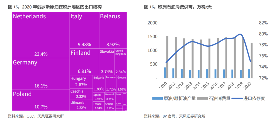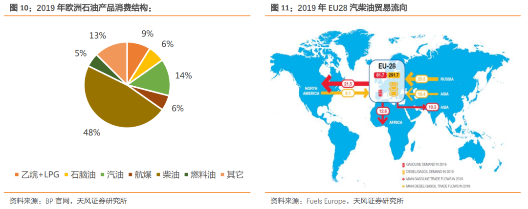 第一、欧洲成品油消费结构柴油占比高,且依赖俄罗斯,第六轮制裁落地可能加大欧洲成品油尤其是柴油的供给缺口。2019年EU28进口量达到5000万吨,其中有2550万吨来源于俄罗斯,占比高达51%,进口自亚太和北美的分别1840万吨、610万吨,俄罗斯石油禁运给欧洲柴油供给带来压力较大。