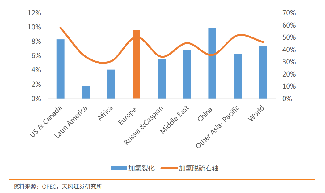 加氢裂化和加氢精制是增产化工品、提高油品质量的重要措施,从全球对比来看,欧洲炼厂的加氢能力处于领先水平,加氢裂化占炼厂一次加工能力的 9.6%,比重高居全球第二;加氢精制占炼厂一次加工能力的 50%,比重居全球第三。