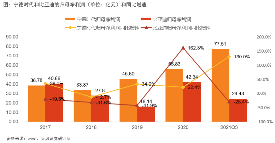 比亚迪和宁德时代是国内新能源汽车的两大巨头。2021年,比亚迪的新能源汽车销量全国第一,国内动力电池装机量位列第二,成立弗迪电池开启动力电池外供业务,在新能源汽车全产业链布局形成了显著的协同效应;宁德时代的国内动力电池装机量以52%的市占率稳居第一,通过投资、收购等方式积极布局产业链上下游,除了纵向垂直整合电池产业链,宁德时代还以电池为核心,在三电和整车等领域也开始了横向布局。本报告对新能源汽车的两大龙头进行了对比研究:从公司总体情况上看:① 比亚迪和宁德时代都在锂离子电池的领域里深耕多年;② 都比较注重研发,持续投入大量研发资金,有利于持续构建产品竞争力优势,保证公司可持续发展;③ 比亚迪的业务内容较广,包括汽车、电子、二次电池等主营业务,其动力电池等业务正从自供走向外供;宁德时代主要以与电池相关业务为主,并逐步向上下游布局渗透;④ 比亚迪总体营收规模较大,宁德时代营收规模总体保持较快速增长的趋势;⑤ 比亚迪业务范围广,销售利润率存在一定程度的波动,由于新能源汽车尚处于高速发展期,我们认为其整车业务尚未充分实现盈利,随着新能源汽车业务的高速增长和刀片电池的外供,未来盈利可期;宁德时代的盈利能力一直较强,且比较稳定,各项业务的毛利率均在相对较高水平,近两年随着业务发展,储能业务的毛利率有了较大幅度提升。从动力电池业务上看:① 宁德时代提出六大理念,电池各项性能指标都达到行业领先水准,布局了包括钠离子电池在内的多项等下一代电池技术;比亚迪深耕磷酸铁锂电池领域,2020年推出了刀片电池技术,具备长续航、高稳定性、高安全性的技术优势。② 宁德时代和比亚迪在国内动力电池装机量中稳定位居第一和第二,市场份额明显高于其他厂家。③ 宁德时代自建生产基地和与车企合资的规划产能分别超过650GWh和140GWh;比亚迪公布的总产能规划已达到300GWh。④ 宁德时代通过投资、收购等方式积极布局产业链上下游,通过产业链的整合保障产能和利润空间;比亚迪目前在新能源汽车行业的布局已经贯穿产业的上、中、下游以及后市场,初步构成了产业链闭环,形成了协同效应。⑤ 宁德时代和比亚迪的上游材料供应链体系数质兼具,多供应商的模式加强了对供应商话语权,增加自身供应商的质量和供应体系的稳定性。⑥ 宁德时代全面覆盖市场主流车企客户,质优且分散,为其持续高速发展奠定了坚实基础。比亚迪除了自供之外,正通过弗迪电池开启外供业务,刀片电池产能的陆续释放和外供业务的逐步拓展,将为公司创造第二增长曲线。从其他相关业务上看:① 比亚迪是国内新能源汽车的领军者,已构建起传统燃油、混合动力、纯电动车全擎全动力产品体系,在新能源汽车产业链已经形成了完整的闭环,具备显著的协同效应;宁德时代除了纵向垂直整合电池产业链,还以电池为核心,在电机、电控和整车等领域开始了横向布局;② 宁德时代的储能业务高速发展,为公司形成第二增长曲线;比亚迪的储能业务已遍布全球23个国家,100多座城市,全球累计销售超过700MWh。总体而言,比亚迪的优势体现在新能源汽车和动力电池领域均为行业龙头,在新能源汽车行业的布局已经贯穿产业的上中下游与后市场,构成了产业链闭环,形成了协同效应,并通过动力电池外供业务为公司成长注入新动力;宁德时代的优势体现在动力电池业务市场份额较高,全面覆盖市场主流车企客户,已经完成动力电池产业链上下游的深度布局,并通过快速成长的储能业务形成第二增长曲线;投资建议:新能源汽车销量快速稳定增长,动力电池市场空间广阔。推荐在新能源汽车行业贯穿产业上下游布局形成协同效应,动力电池业务开启外供形成第二增长曲线的新能源汽车龙头【比亚迪】;建议关注技术积累深厚、深度垂直整合产业链且下游配套多家优质车企,具备领先优势的龙头电池企业【宁德时代(电新组覆盖)】。风险提示:新能源汽车渗透率提升不及预期、上游原材料持续涨价、动力电池行业竞争加剧、测算有一定主观性存在偏差风险、跨市场选取可比公司风险。注:文中报告节选自天风证券研究所已公开发布研究报告,具体报告内容及相关风险提示等详见完整版报告。