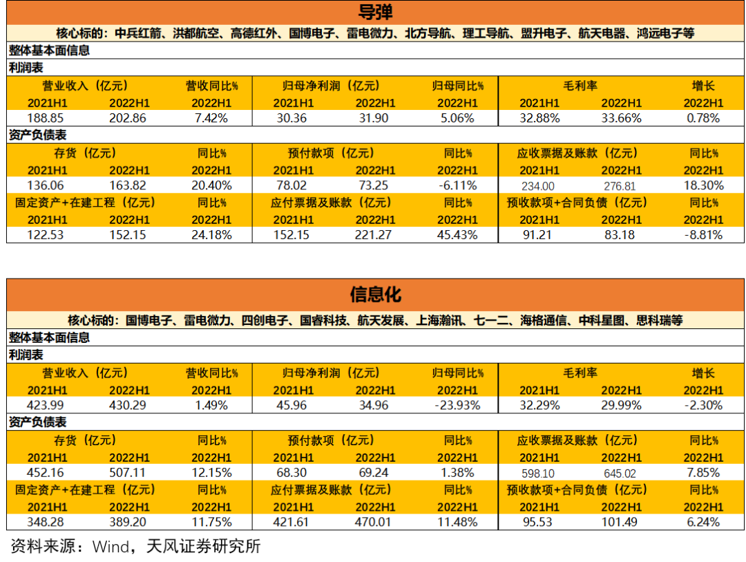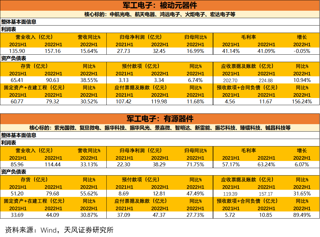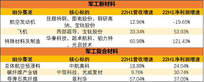 新材料:营收201.22亿元(较21H1+22.01%),归母净利润32.17亿元(较21H1+20.89%),存货较21H1+20.04%,合同负债与预收款较21H1+63.26%。该板块继20年后持续快速增长,从存货及合同负债项判断目前在手订单充足,且处于积极备产备货阶段,行业景气度明确,是景气度持续攀升的军工品种。