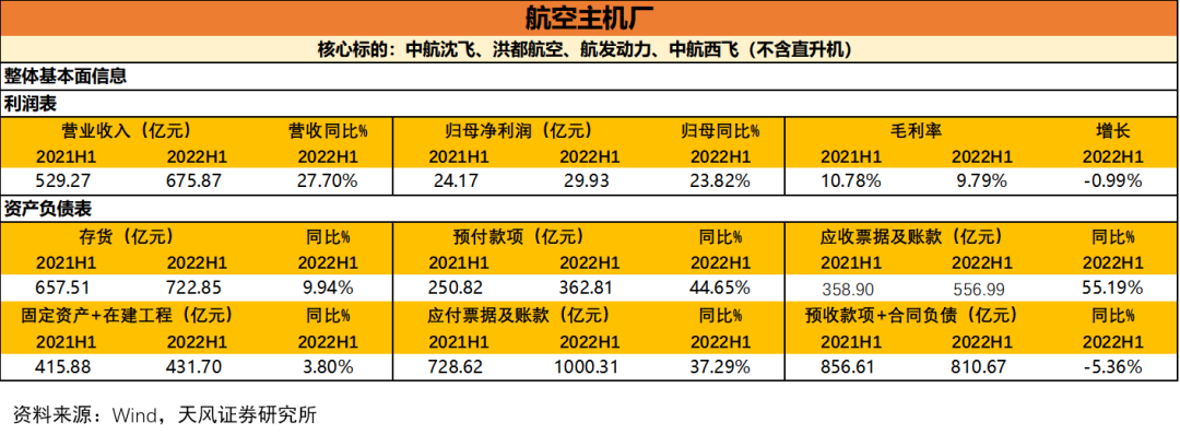 航空主机厂(不含直升机):2022年H1实现营收675.87亿元(较2021年H1+27.70%),实现归母净利润29.93亿元(较2021年H1+23.82%),实现毛利率9.79%,较2021H1下降0.99pcts;存货较2021年H1+9.94%,合同负债+预收款与2021年H1相比保持在同一较高水平(-5.36%),预付账款在2021H1的高基数水平上+44.65%。