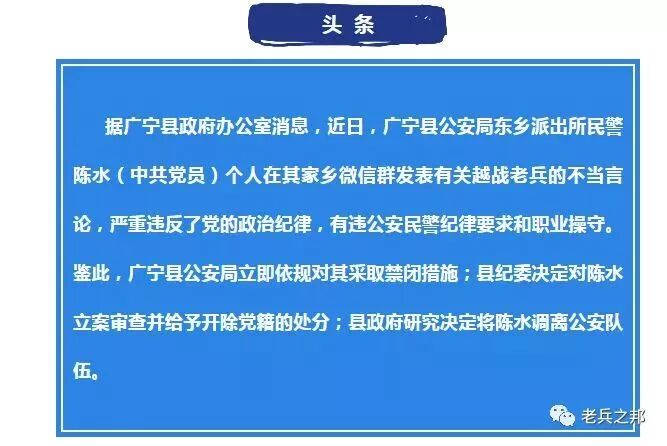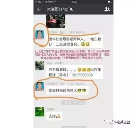 广东广宁县的一陈姓民警近期竟在微信群里口无遮拦,侮辱越战老兵!在微信群里,陈警官称当今社会最乱有两种人,一个是白粉仔,也就是吸毒人员,另一个是越战老兵 ,要严厉打击这两种人!