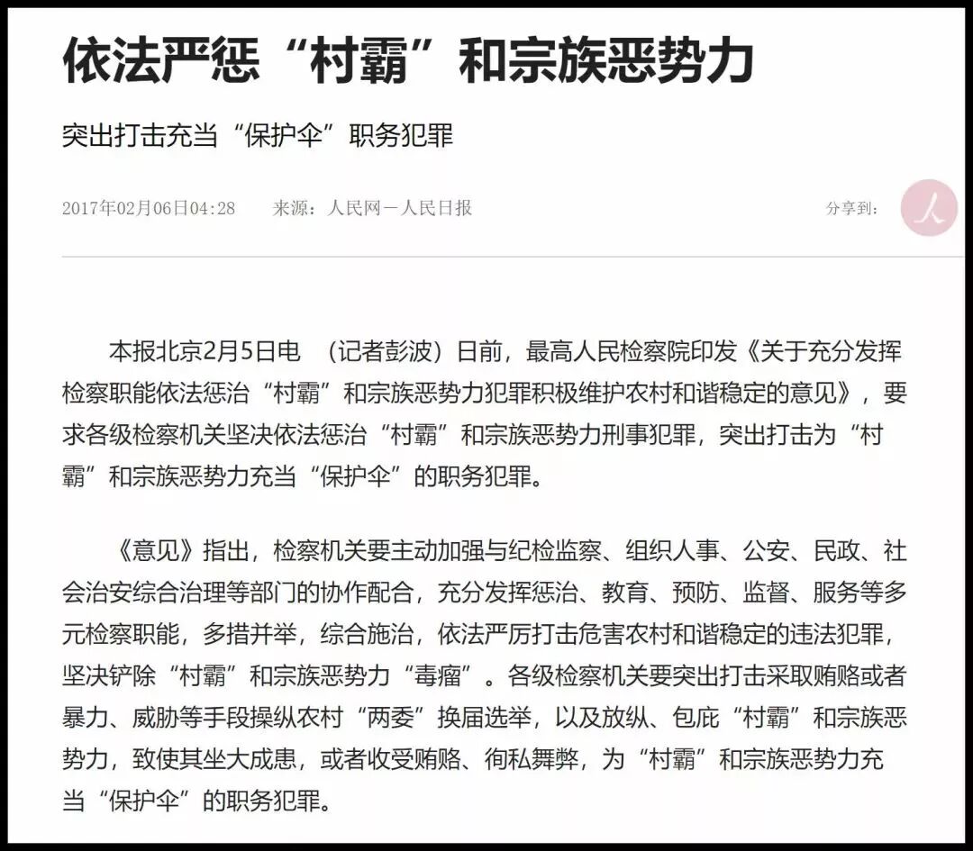 2018年1月,中共中央、国务院发出《关于开展扫黑除恶专项斗争的通知》,2018年1月中纪委会议强调,要把打击基层腐败跟扫黑除恶结合起来,全面打击村霸黑恶势力。最高人民检察院印发的《关于充分发挥检察职能依法惩治“村霸”和宗族恶势力犯罪积极维护农村和谐稳定的意见》,就剑指这些“毒瘤”。