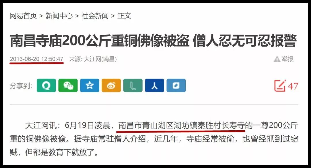 2013年网易新闻曝长寿寺盗窃案件《南昌寺庙200公斤重铜佛像被盗,僧人忍无可忍报警》