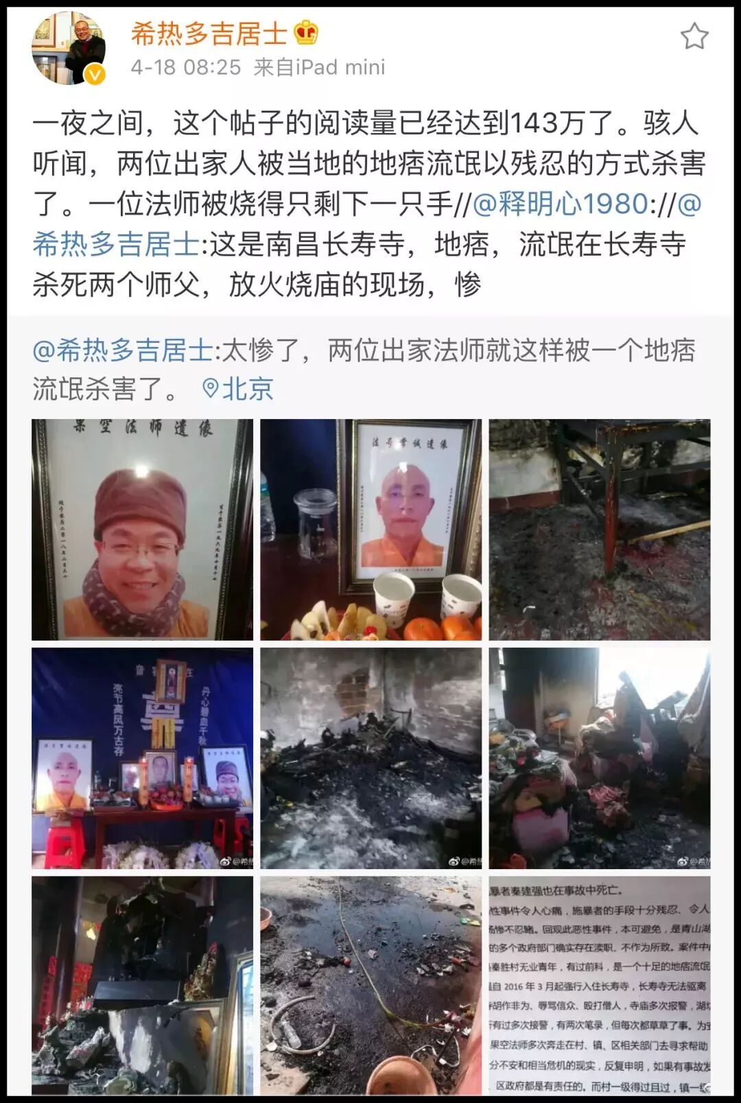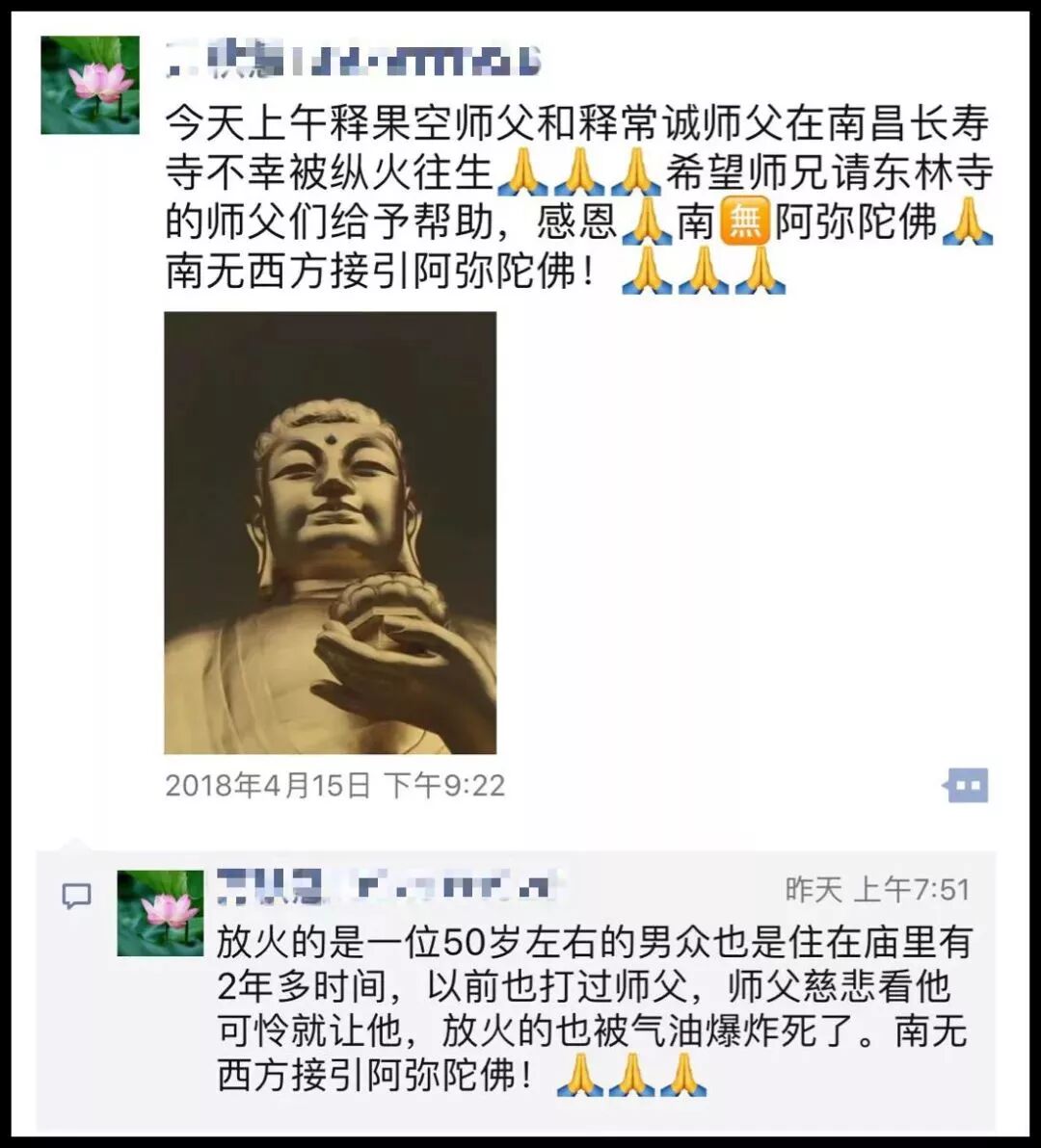 2018年4月15日晚间,江西南昌长寿寺惨遭当地一名男子袭击施暴,纵火焚烧寺院,汽油引发爆炸,两位出家师父惨烈身亡,现场惨绝人寰。