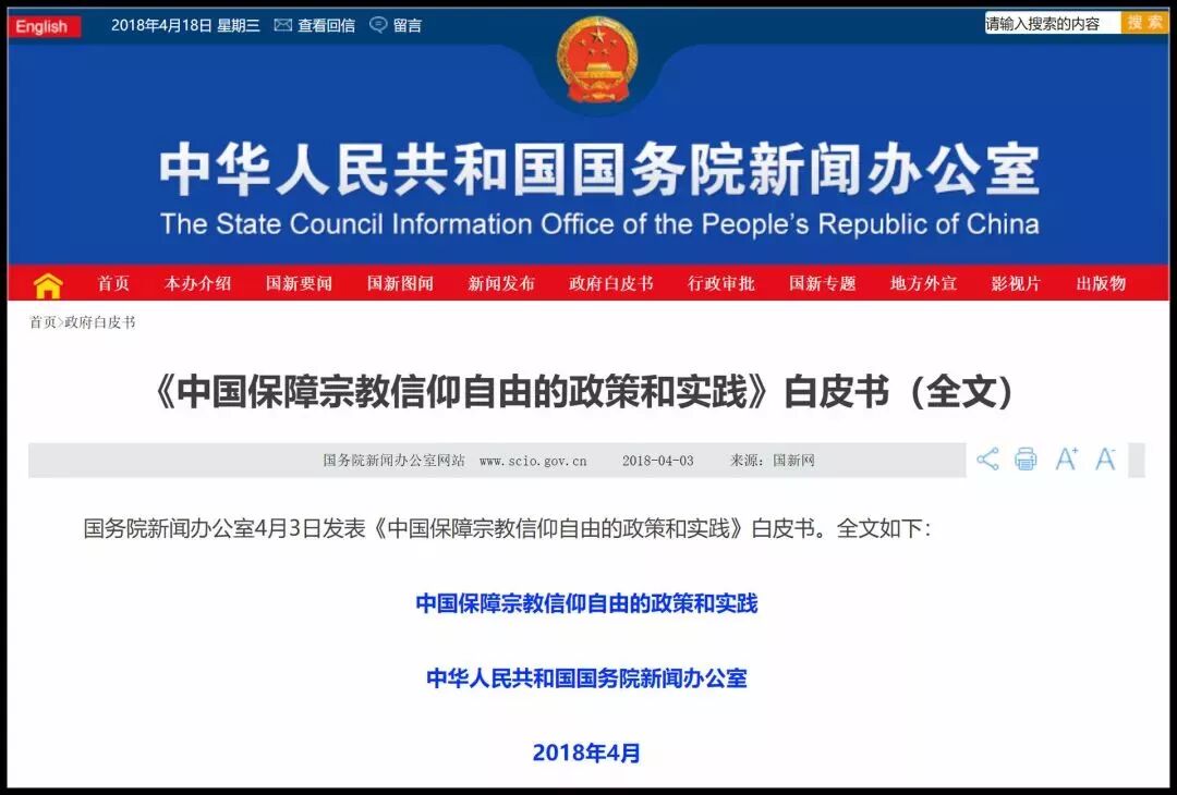 2018年4月3日,国务院新闻办公室发表《中国保障宗教信仰自由的政策和实践》白皮书