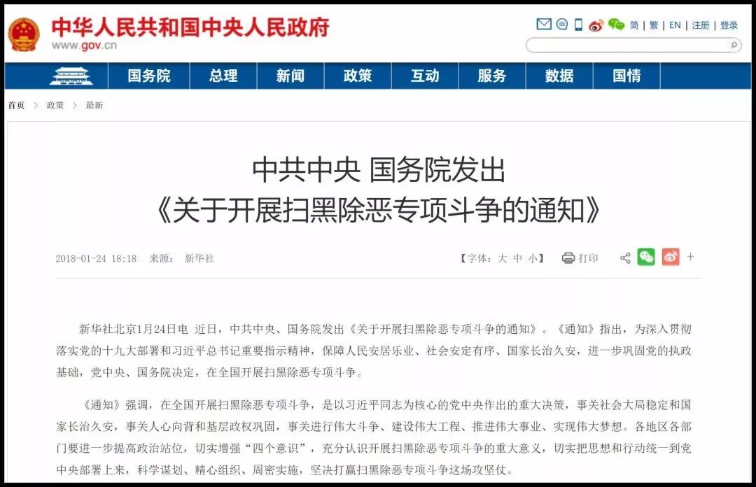 2018年1月,中共中央、国务院发出《关于开展扫黑除恶专项斗争的通知》