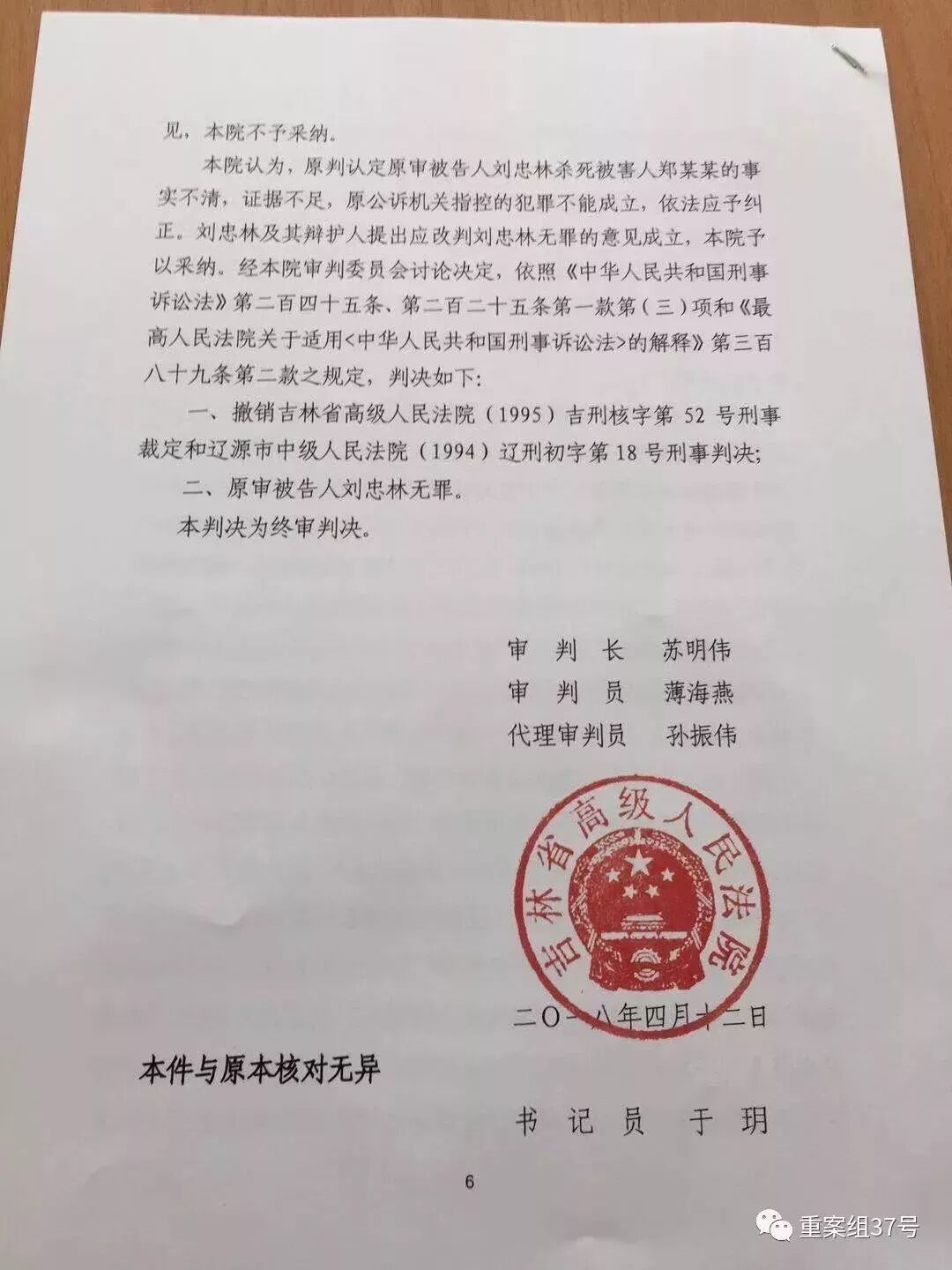 2018年4月20日上午10点,吉林省高级人民法院宣判刘忠林故意杀人一案再审,改判刘忠林无罪。