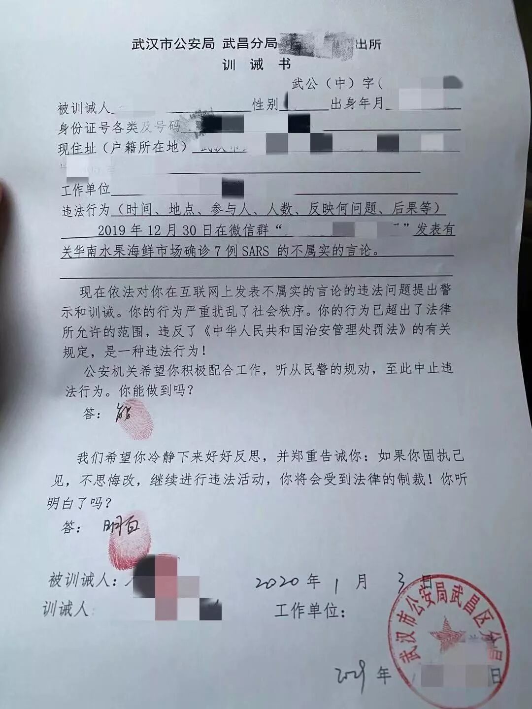 下面这张图就是武汉警方出示的训诫书原图,出于对当事人的保护,我们隐去当事人信息。