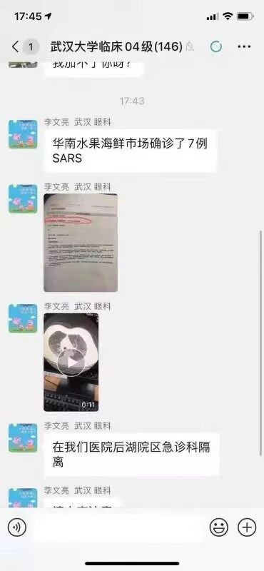 2019年12月29日下午,一张聊天记录截图被大量转发,发布者是一位医生,发布的地点是在大学同学群内,发布的内容是“华南水果海鲜市场确诊了7例SARS,在我们医院急诊科隔离”。