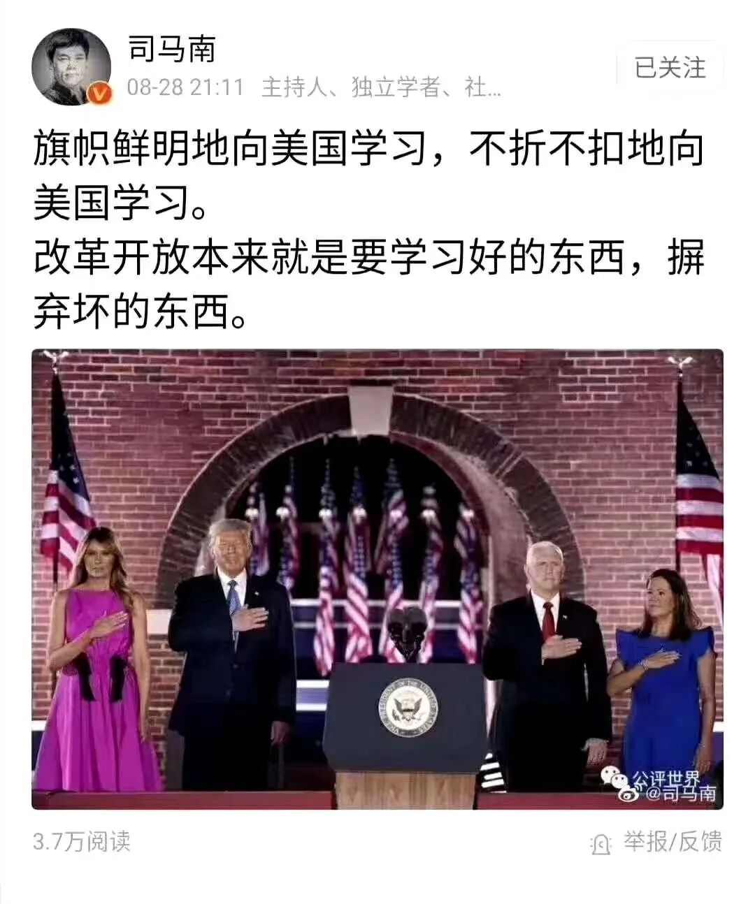 2020年8月28日深夜,网络红人司马南在微博上发表了新的观点,表示要旗帜鲜明的向美国学习,不折不扣的向美国学习,他甚至委婉的认为改革开放就是要向美国学习。