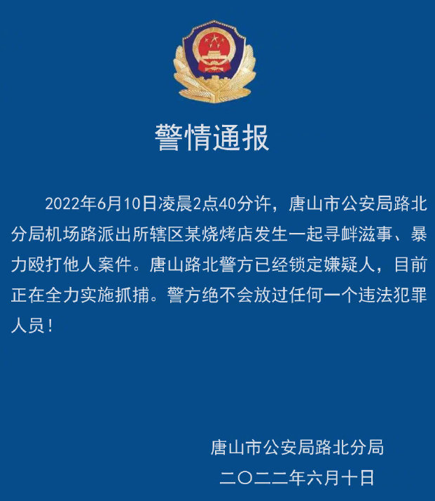 2022年6月10日晚间河北唐山夜市多名男子殴打女子的行为,是继唐山大地震以来引发全国关注的极其恶劣的社会事件。
