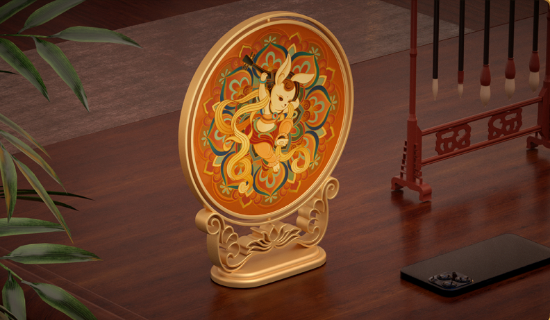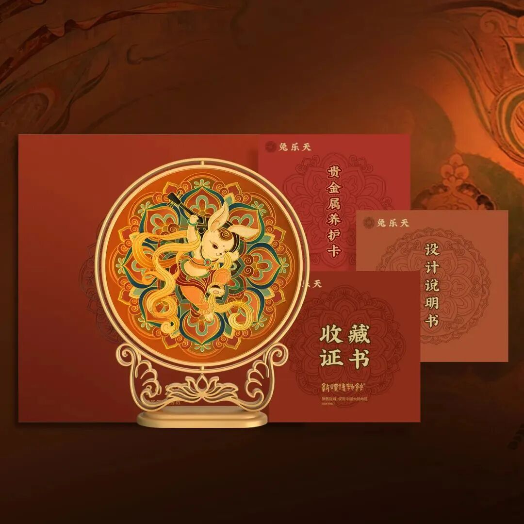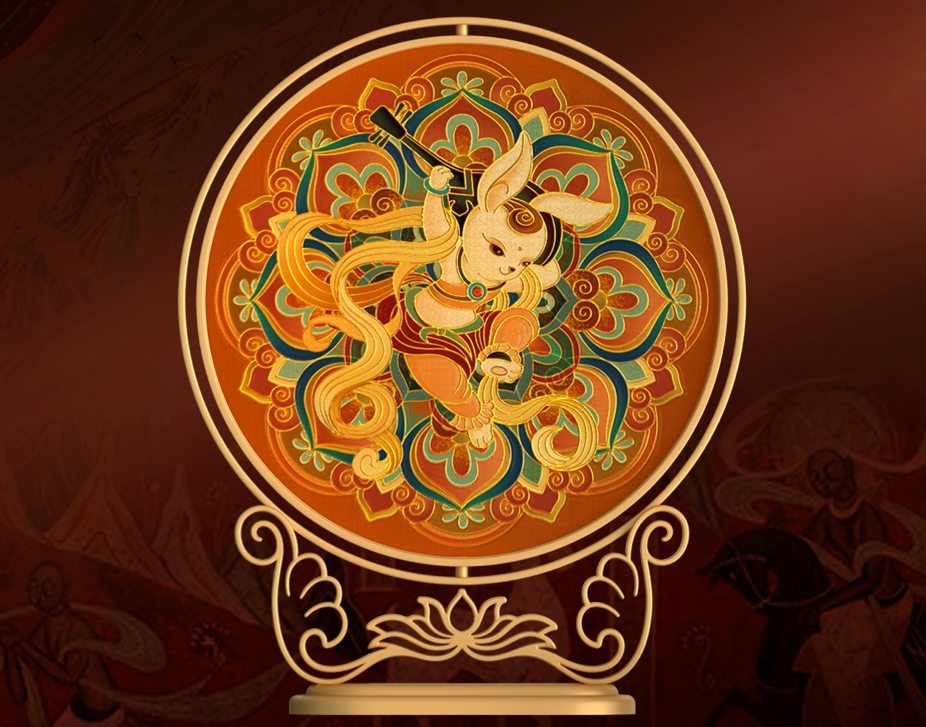 它以反弹琵琶为灵感,浓厚的敦煌风格下,是一只拟人化的飞天玉兔在时间的长河里纵情弹奏,享受音乐的快乐。