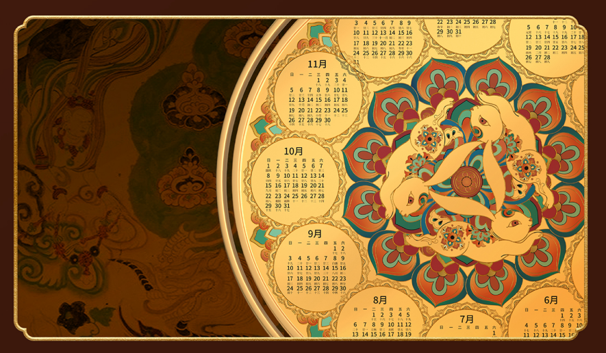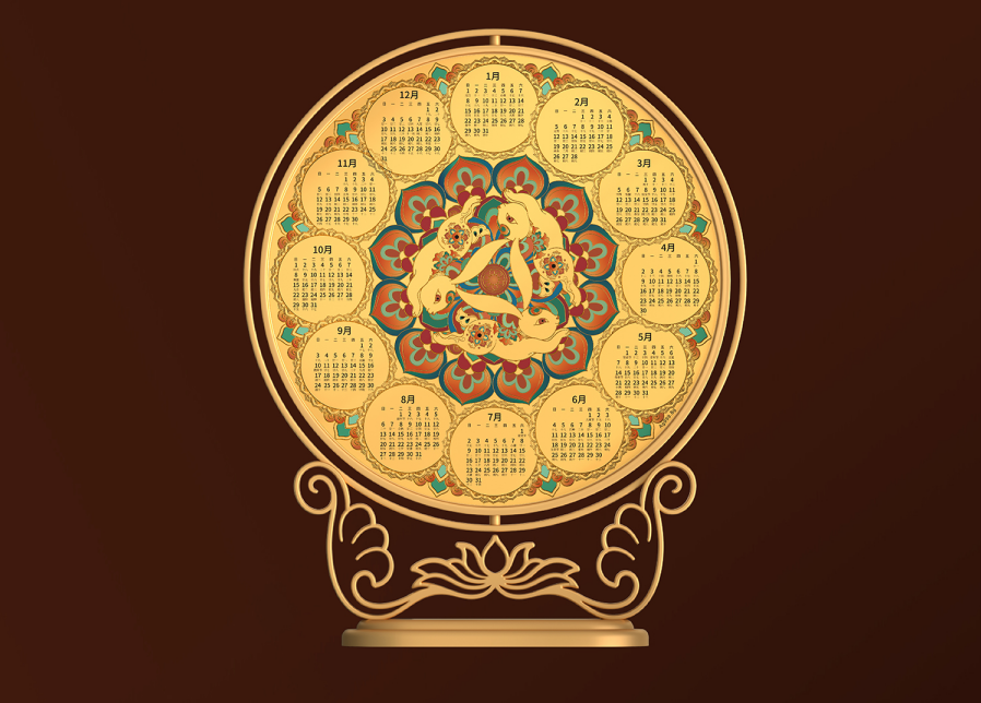 将三兔共耳作为月历正中间的图腾,无论是前世今生来世的轮回,还是三位一体的象征,它都能带来一种宁静平衡的感受,传达吉祥之物对未来美好的祝福。