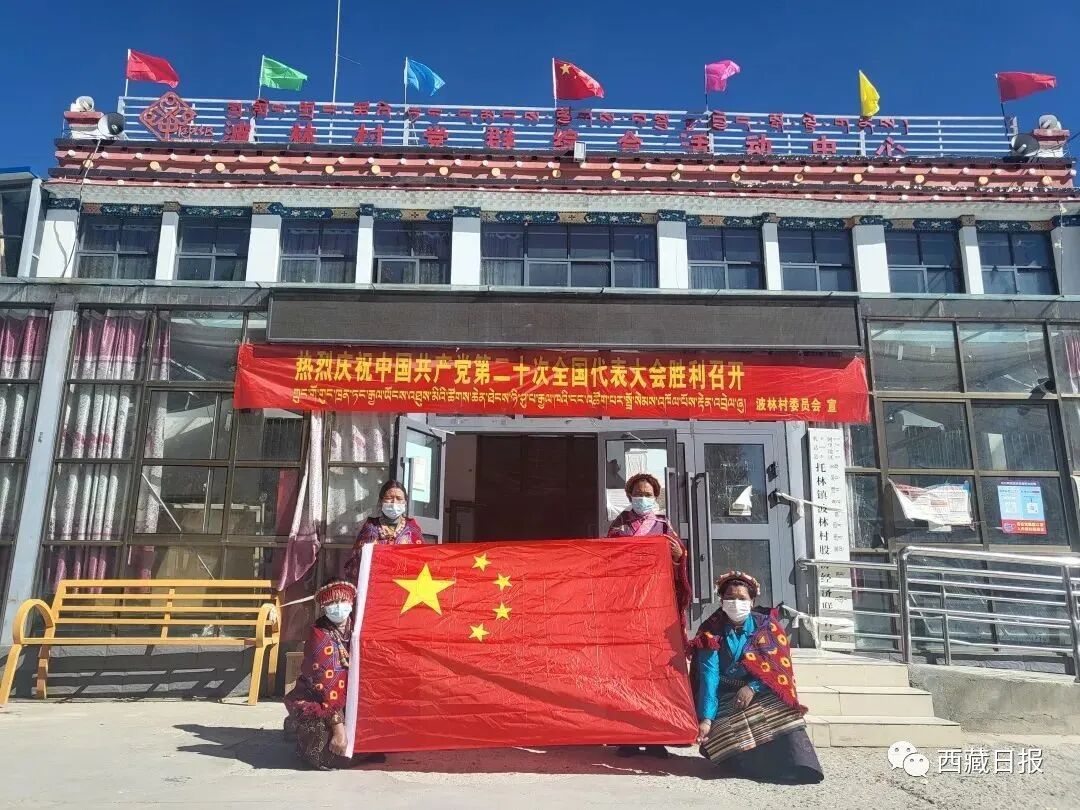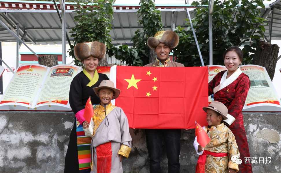 林周县强嘎村村民与国旗合影。通讯员 旦增次成 摄