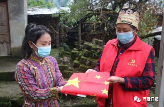 10月1日,墨脱县背崩乡波东村党员群众开展升国旗唱国歌活动,庆祝祖国73岁生日,并向群众赠授国旗。莫天华 摄